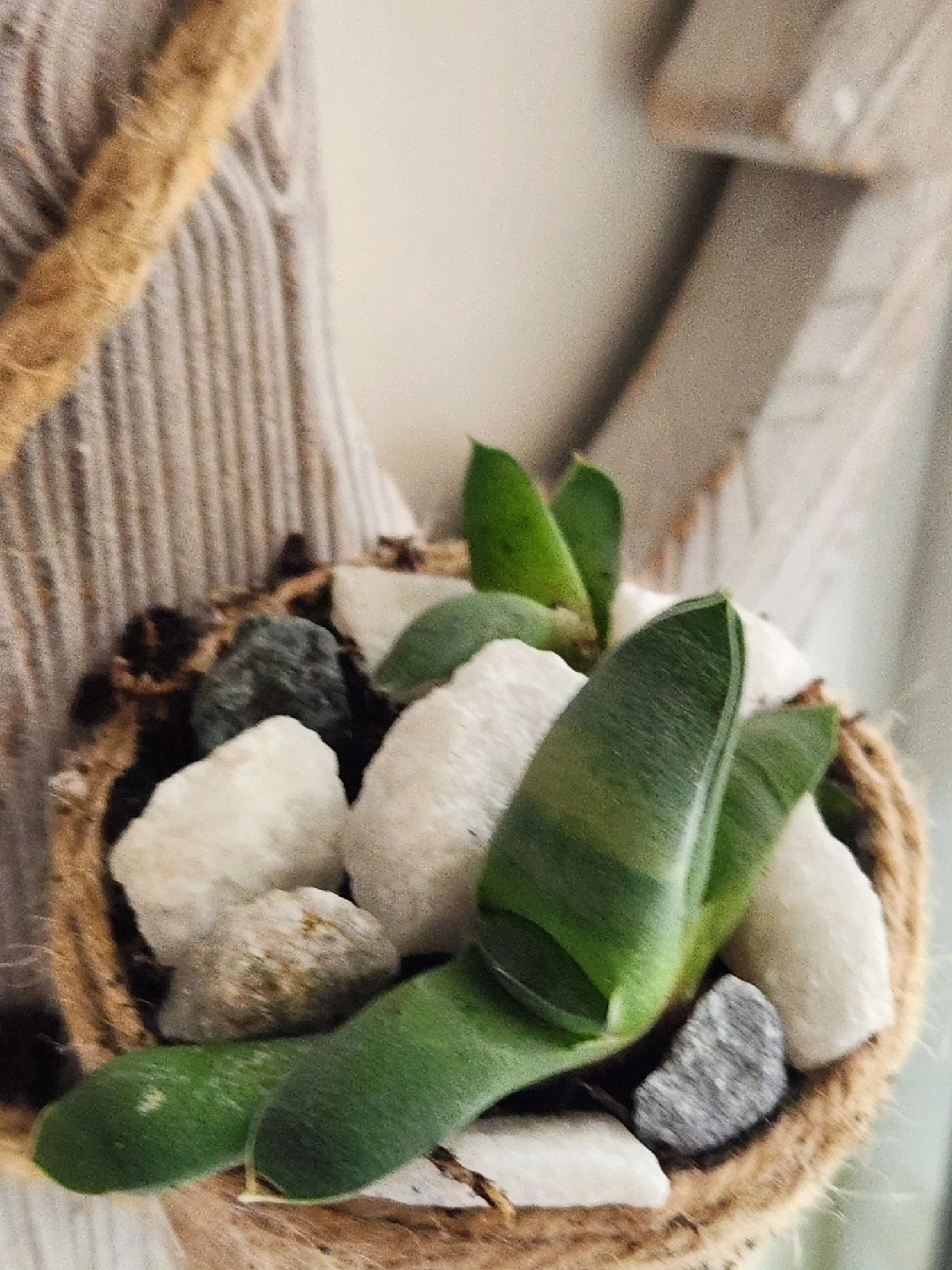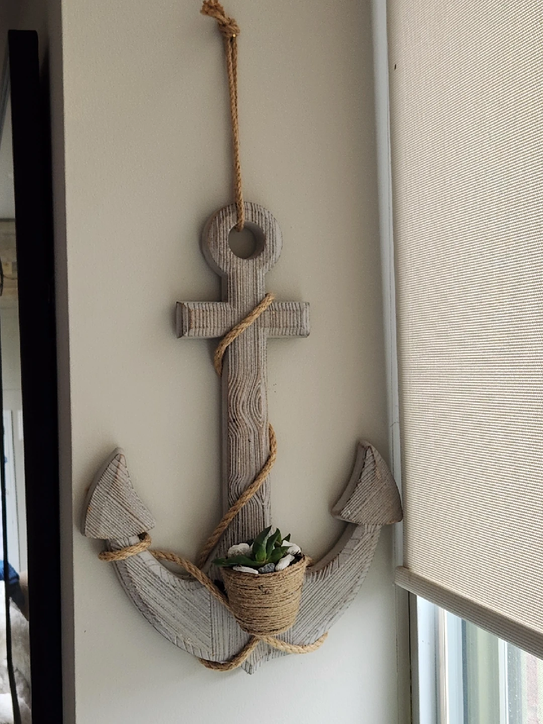 32I'm selling a charming decorative anchor featuring a built-in succulent planter. This unique piece adds a nautical touch to any room. The anchor is made of a light-coloured wood-like material, and the planter has a small succulent plant. The anchor is 18 inches long hangs 24 inches