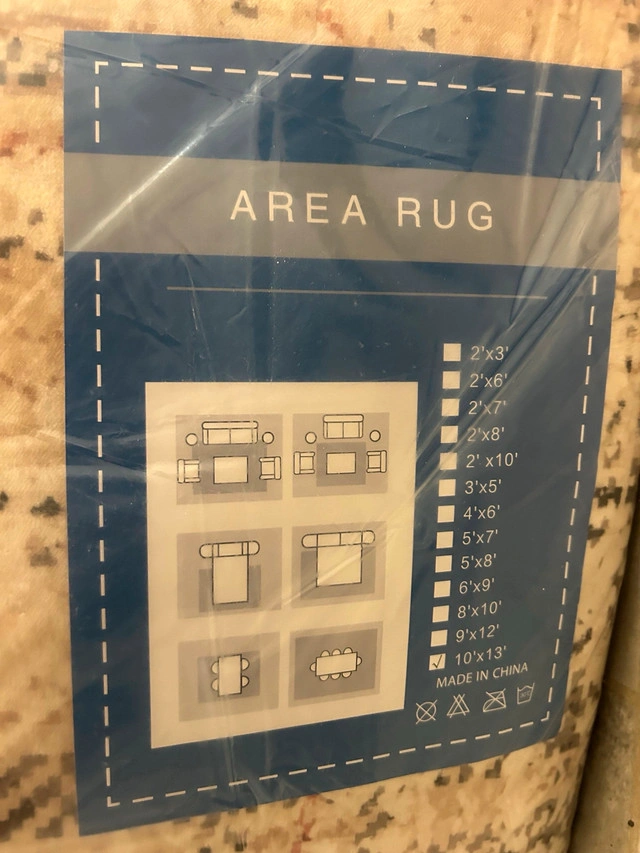 18Brand new area rug 10ft x 13ft. This carpet is unused. Selling because it is bigger for my room. Non shedding stain resistant carpet. Easy to clean, machine washable. Safe and steady.