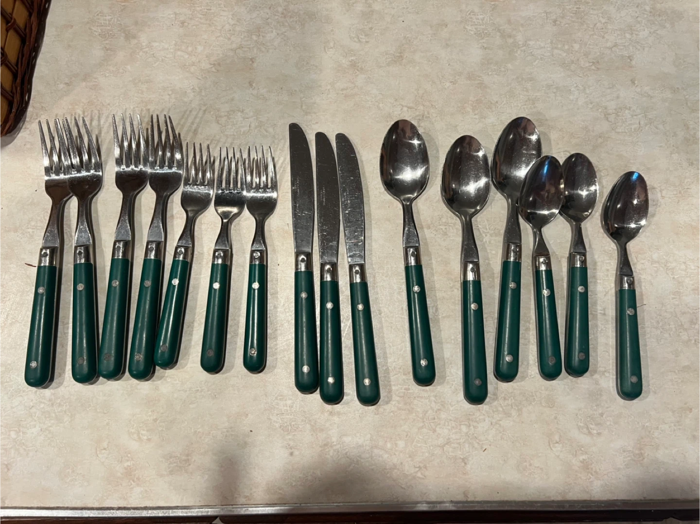 243Here's a cutlery set marked 'Carnival Stainless Korea'. It includes forks, knives, and spoons, all with dark green handles. Perfect for everyday use or adding a touch of retro style to your table!