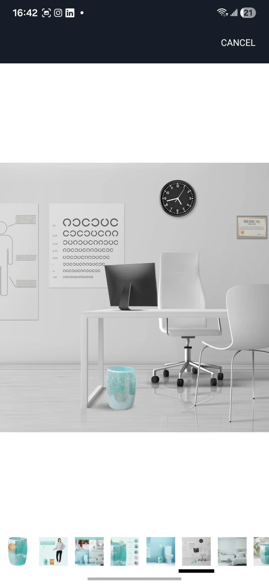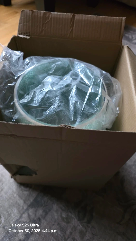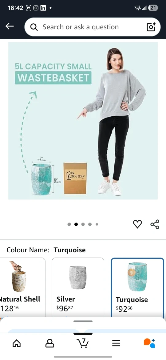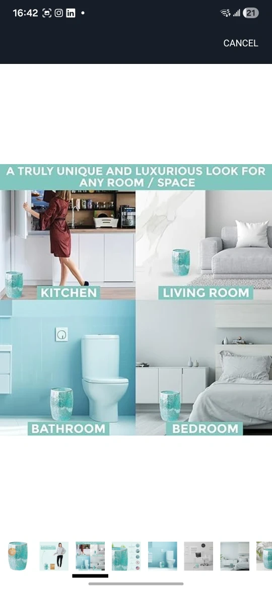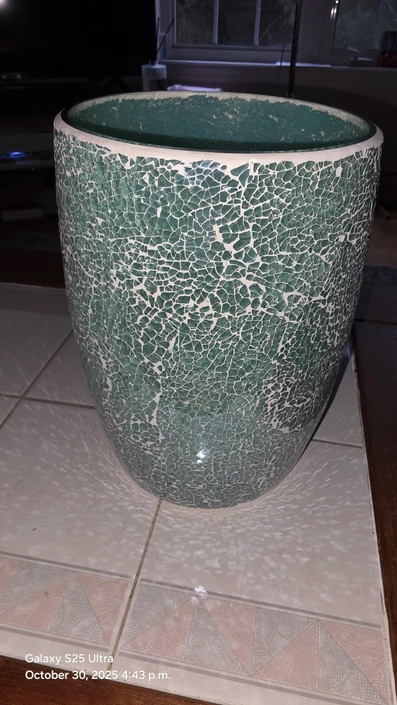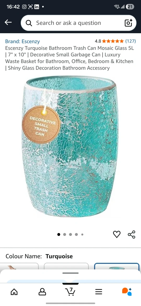 167Add a touch of elegance to your bathroom or any room with this Escenzy mosaic glass trash can! It features a sturdy, thick glass construction and a shiny touch. It's also handmade and odor-free. This USA brand trash can has a 5L capacity and measures 7" x 10".
