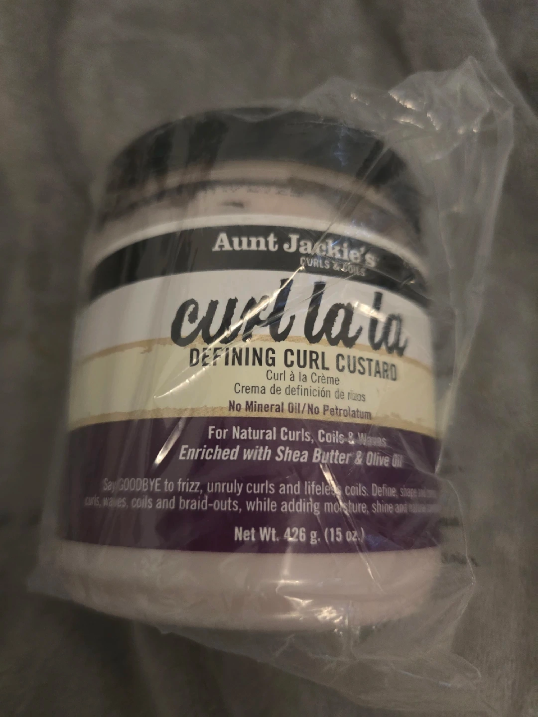 Selling a jar of Aunt Jackie's Curl La La Defining Curl Custard! It's enriched with shea butter and olive oil, perfect for natural curls, coils, and waves. This custard helps define and shape curls, adding moisture and shine. Net weight is 426 g (15 oz).