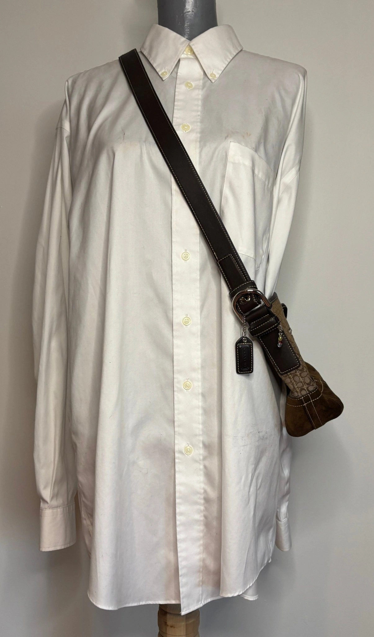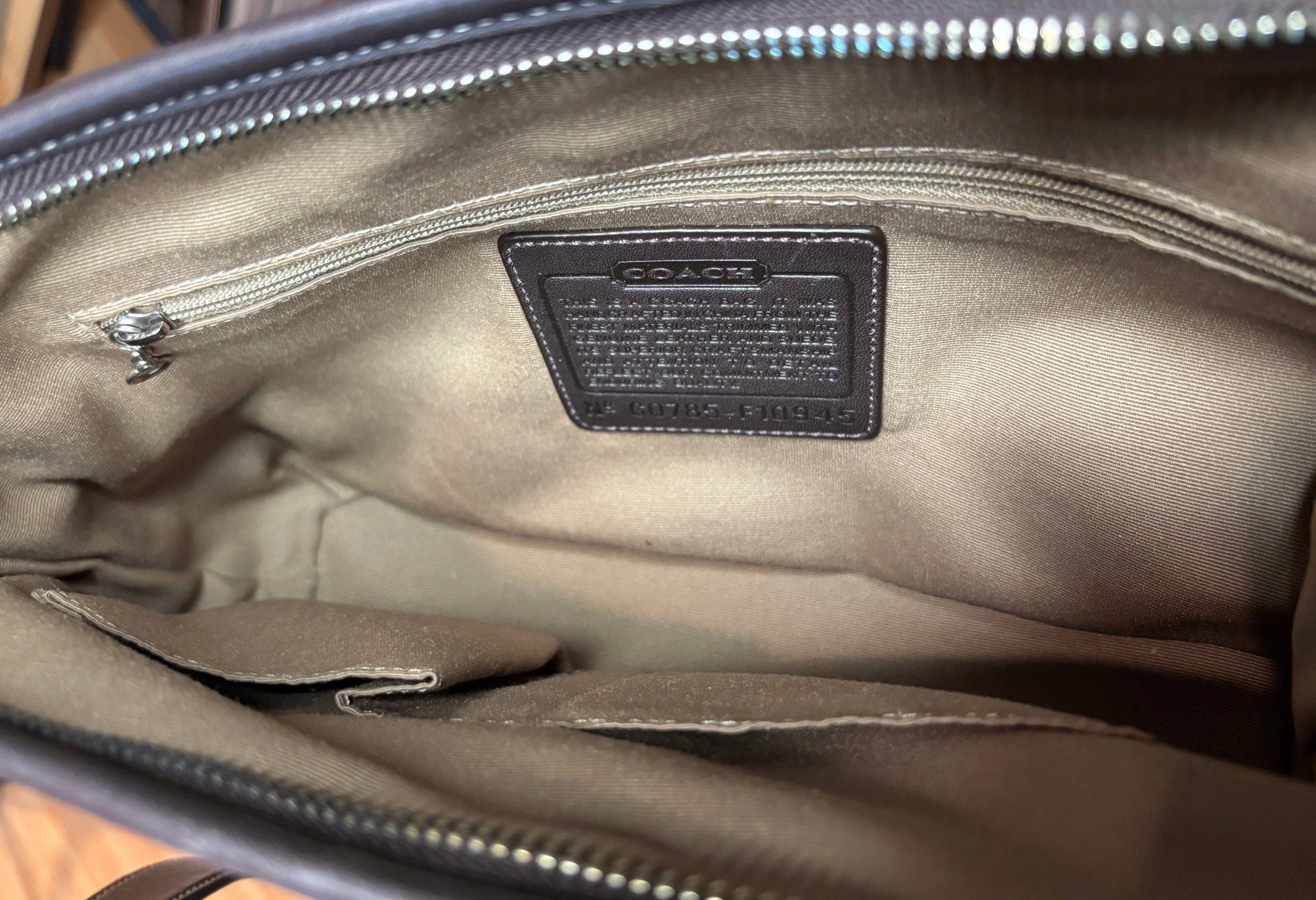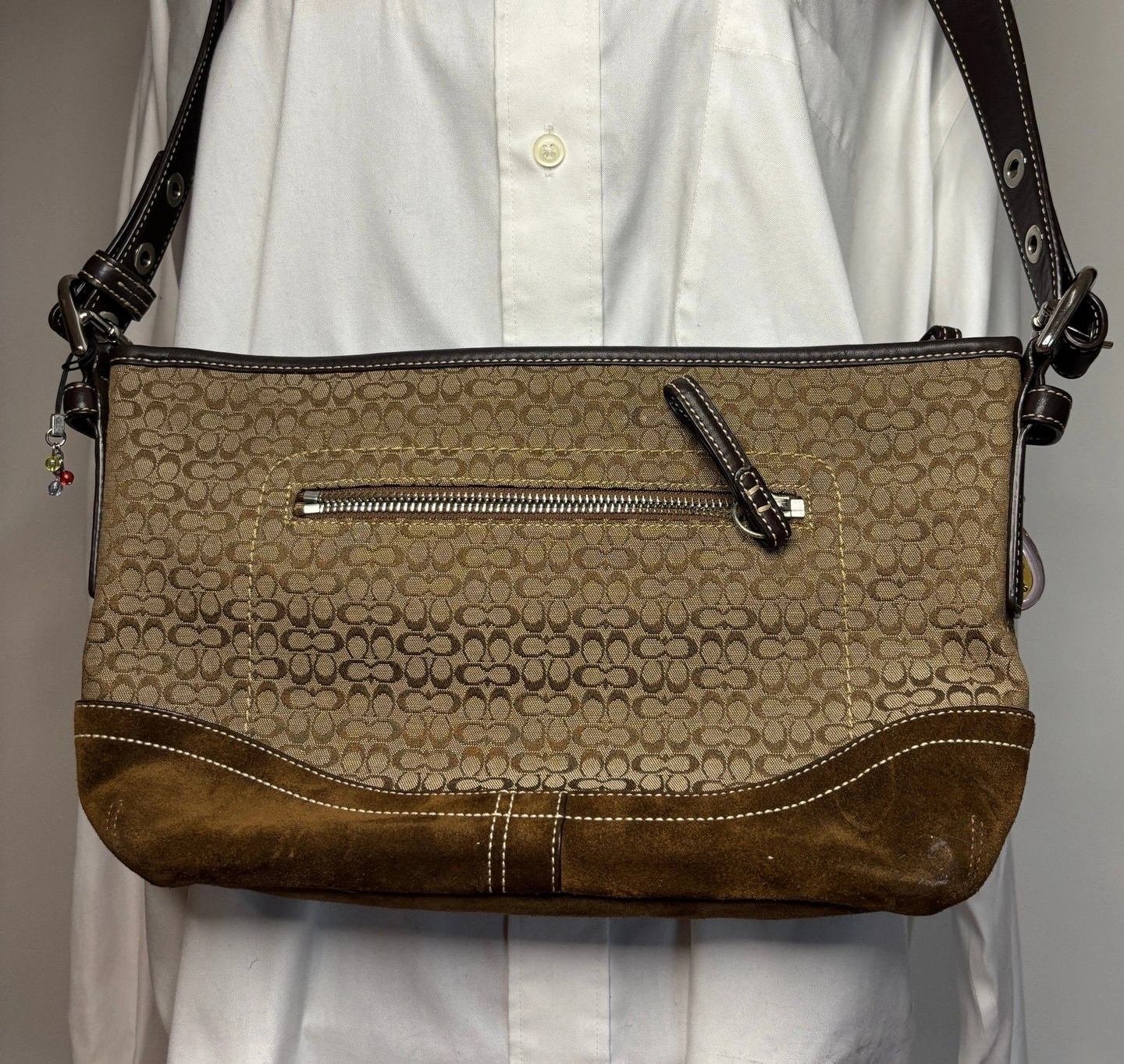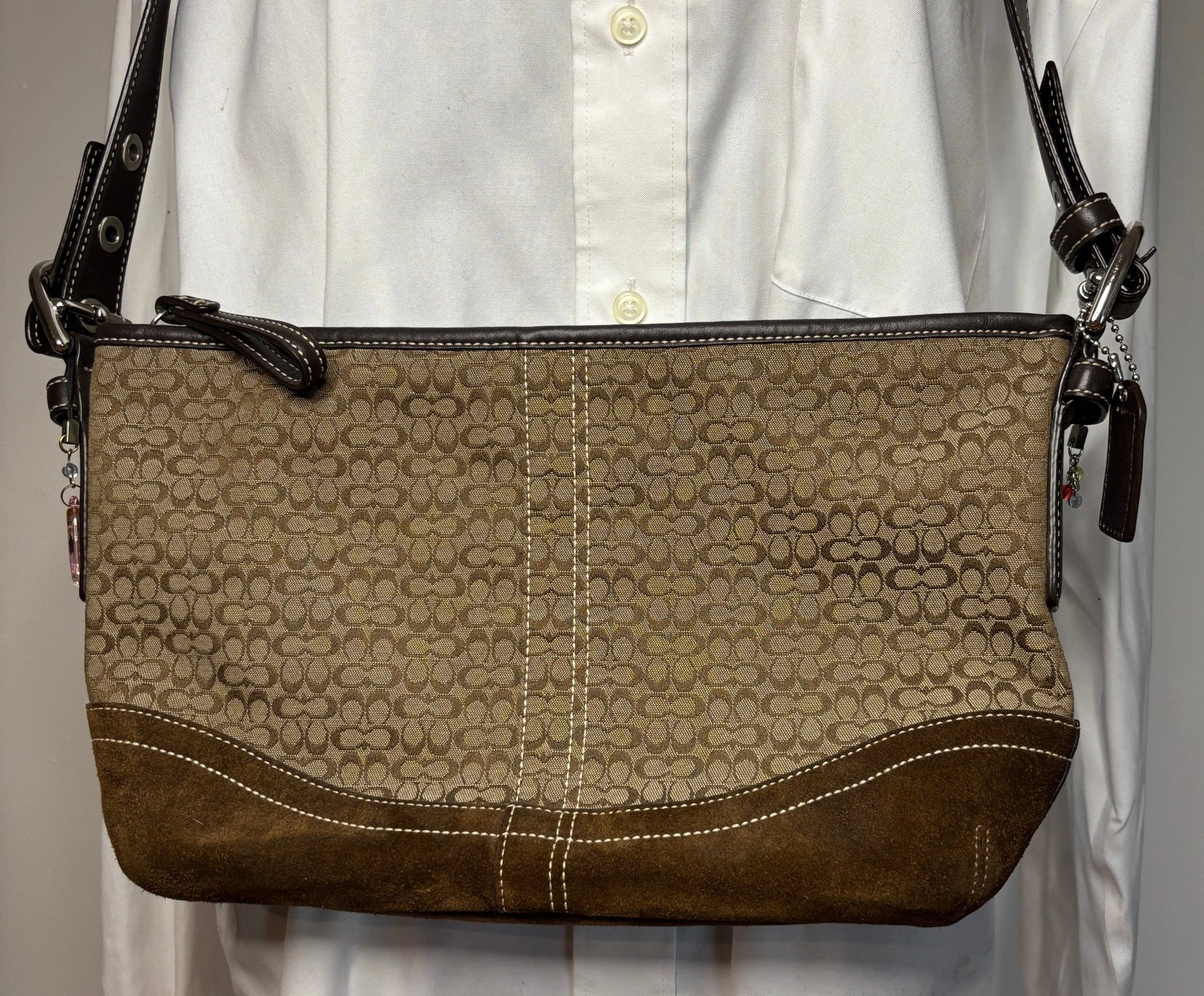 23The Coach Signature Brown Suede and Jacquard Crossbody Purse (F10945) will become a stylish and timeless accessory for any of your wardrobe choices. Designed for everyday use and special gathering elegance, this wonderful Coach purse has the iconic Coach jacquard monogram pattern with luxurious brown suede bottom. Offering you both a sophisticated yet casual look, this versatile purse has a zippered closure that leads into the main compartment that possesses one interior zippered pocket and a divided open pocket. With a spacious interior and signature Coach detailing, this purse is perfect for work, travel, or nighttime outings and blends effortless style and use. It comes with a keychain to add that perfect touch to your ensemble. Add style and substance to your wardrobe accessories with this stunning and versatile cute Coach Soho Signature Brown Suede and Jacquard Crossbody Purse. Local pickup is in Etobicoke near Islington and The Westway. We offer shipping and local delivery for this item. Please send a message about availability and cost associated with these respective services. Alternately, if you wish to pay by credit card or Paypal and have it shipped, you can order it on our website by copying and pasting this link into your browser: https://hljathome.com/products/coach-soho-signature-brown-suede-and-jacquard-crossbody-purse-f10945
