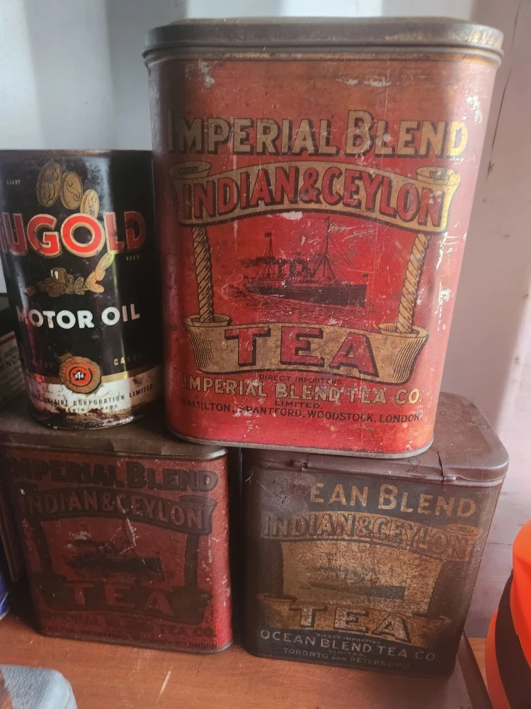 Selling a collection of vintage tins! There's an Imperial Blend Indian & Ceylon Tea tin from Imperial Blend Tea Co, a tin, and an Ocean Blend Tea tin from Ocean Blend Tea Co. They show signs of wear and age, adding to their vintage charm asking $25 each or $60 for all