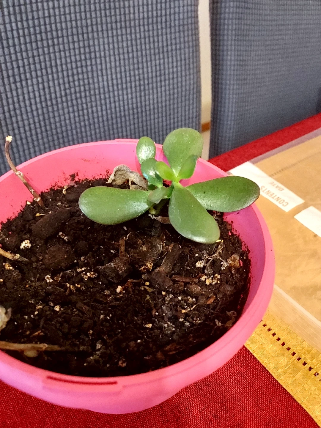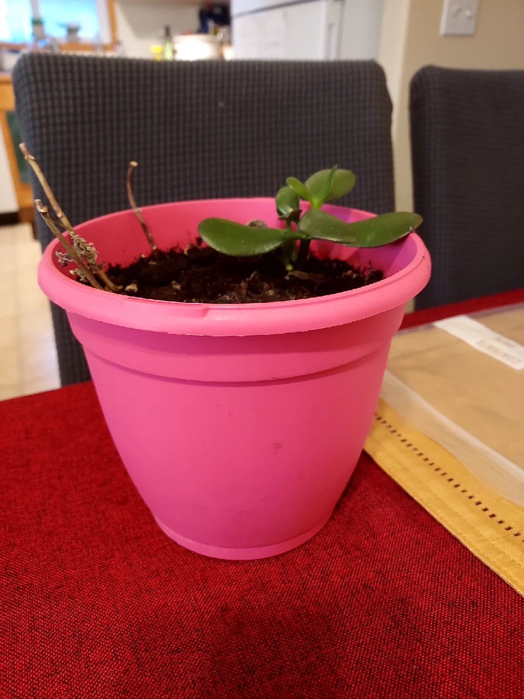 I'm selling a small jade plant in a pink pot. It's a cute little plant that would look great on a desk or windowsill. It's easy to care for and brings a touch of green to any space