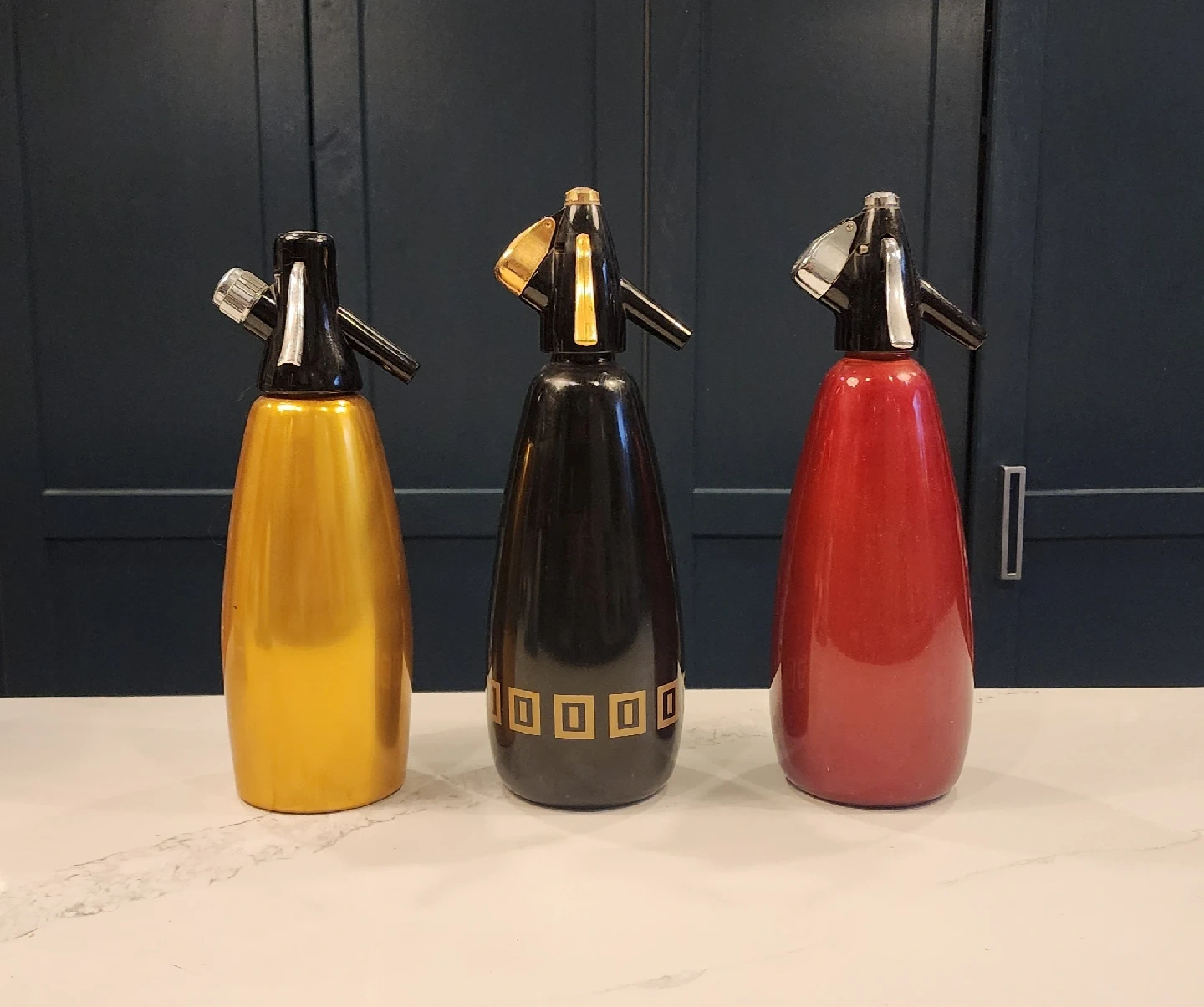 40Selling these vintage soda siphons fantastic for bar decor. Red and Black are BOC. Gold is Gima's and comes with original box. Gold has 2 small nicks. Black has two small scuffs. Red in perfect condition.