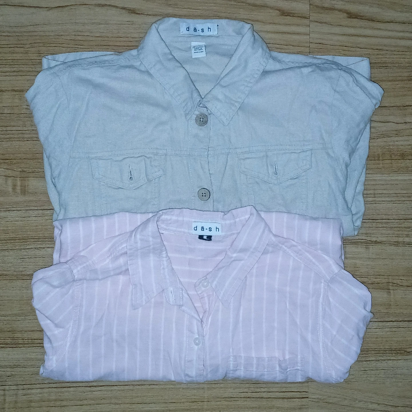Selling two d.a.sh women's shirts in size L. One is a light gray button-down with pockets, and the other is a pink and white striped button-down. Both are in good condition and ready for a new home!