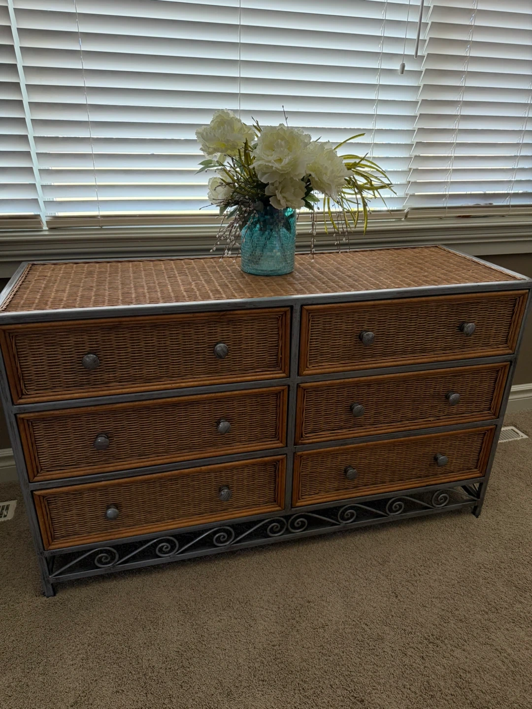 Selling a charming dresser with a wicker top and drawer fronts, complemented by a sturdy metal frame. It features six drawers, perfect for organizing your clothes and personal items. The dresser has a unique design that would add a touch of rustic elegance to any bedroom