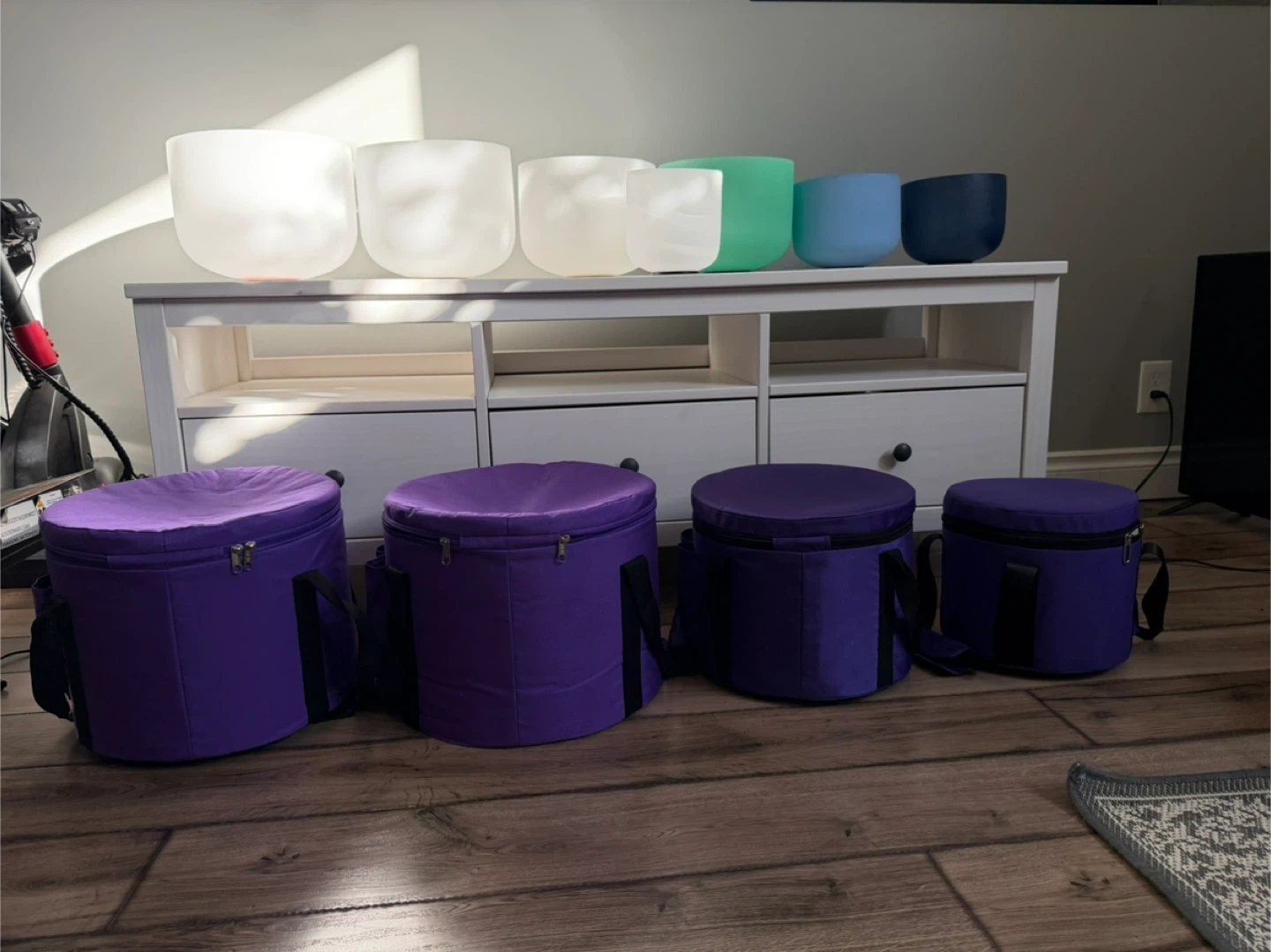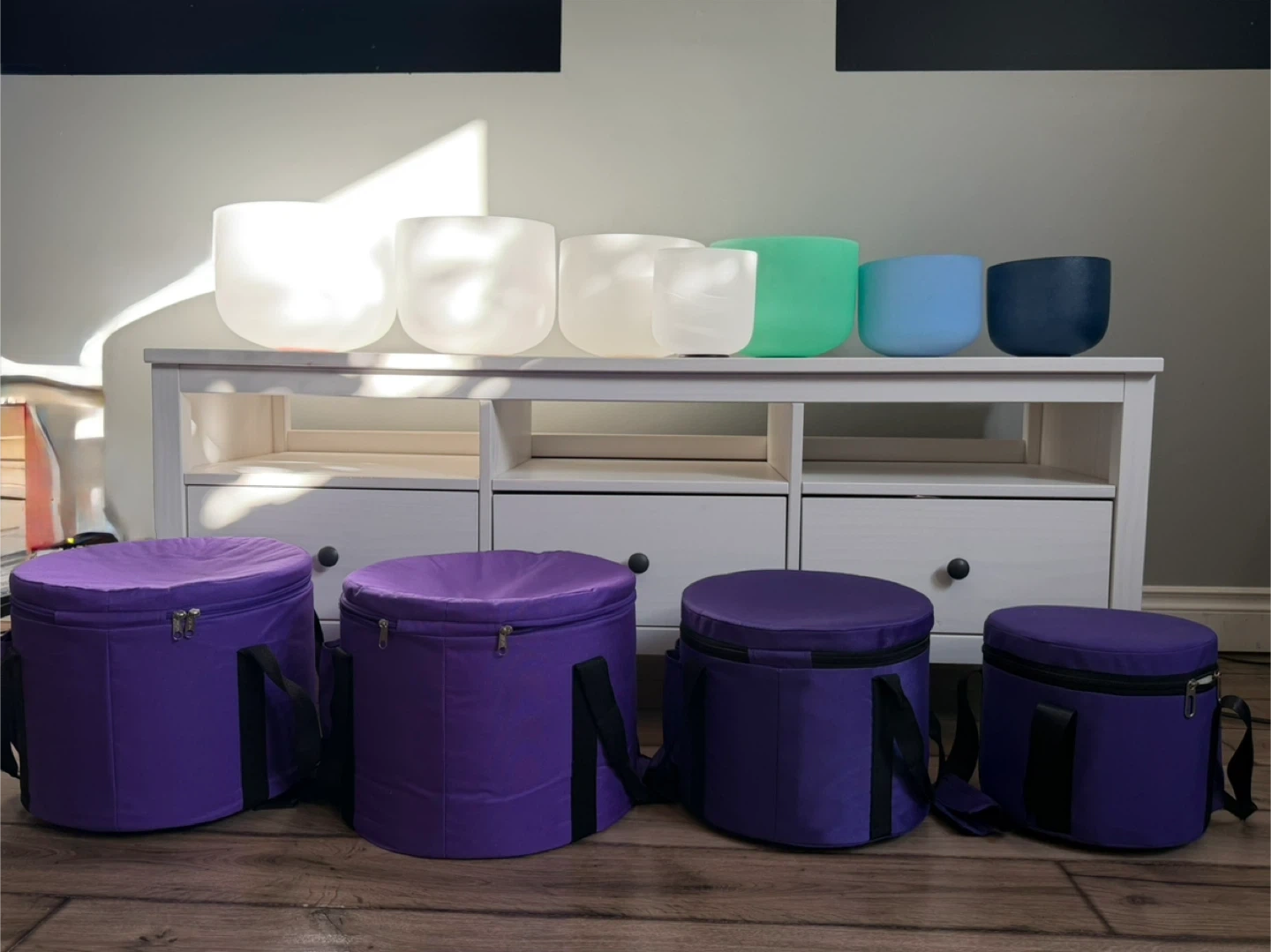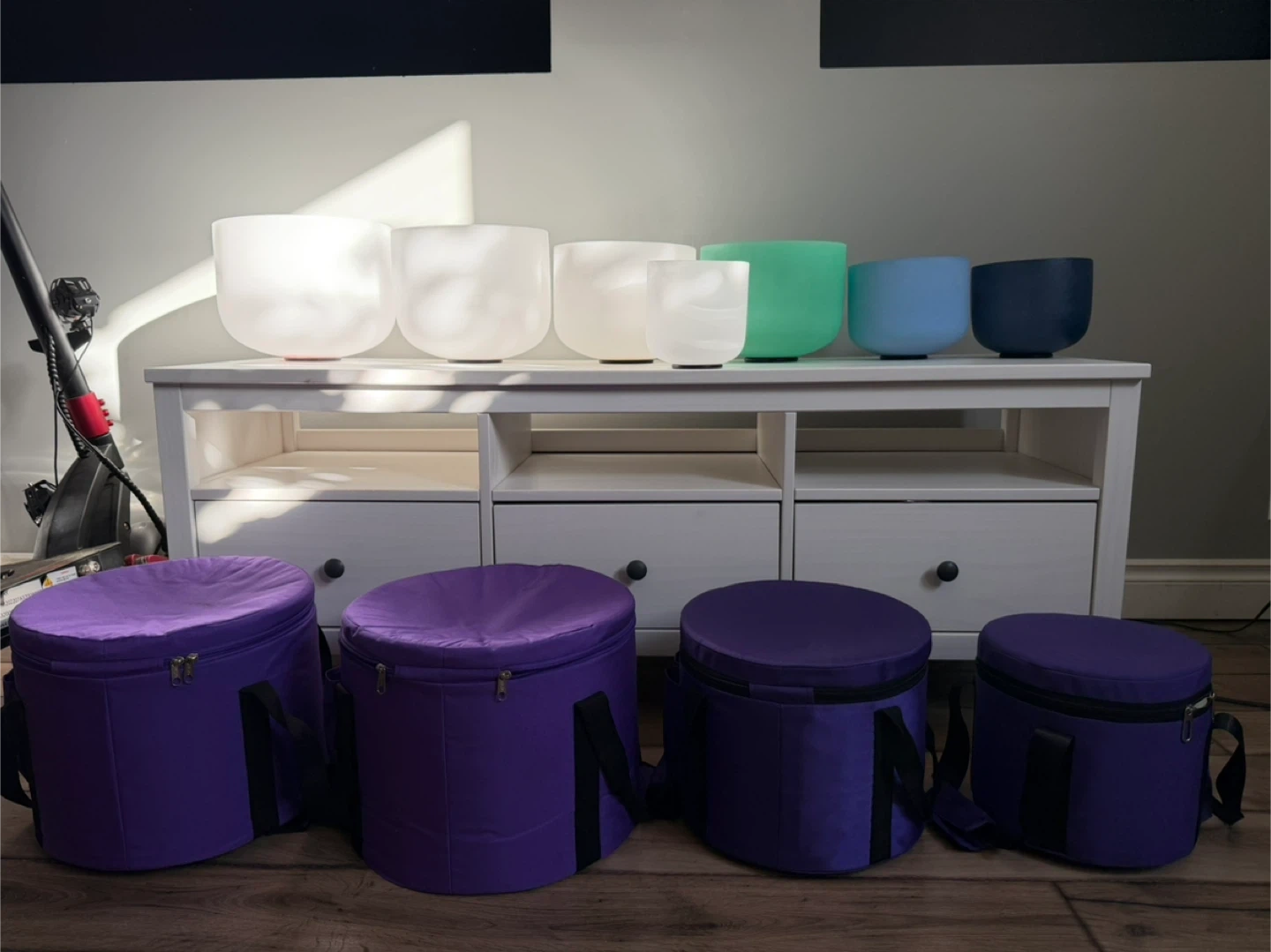 Full 7-Piece Crystal Singing Bowl Set with Carrying Cases