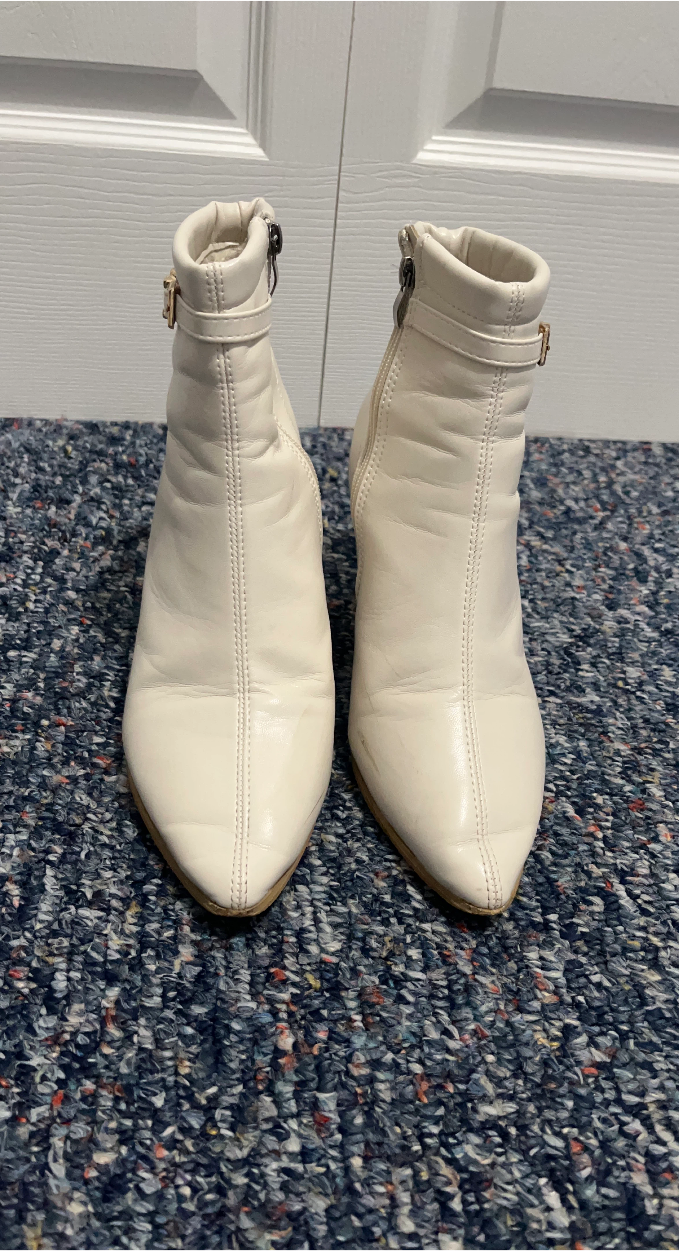 Selling a pair of white ankle boots. They have a stylish design with a zip and buckle detail. Perfect for adding a touch of elegance to any outfit!
