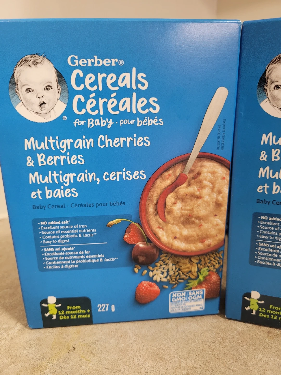 Selling three boxes of Gerber Multigrain Cherries & Berries cereal for babies. These are suitable for babies 12 months and older. Each box contains 227g of cereal. The best before date is December 2026