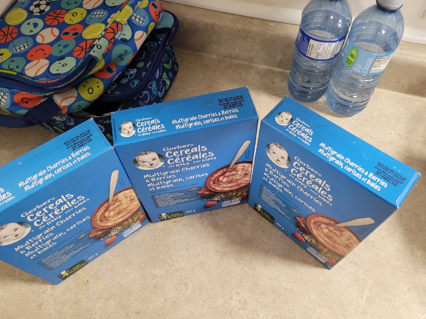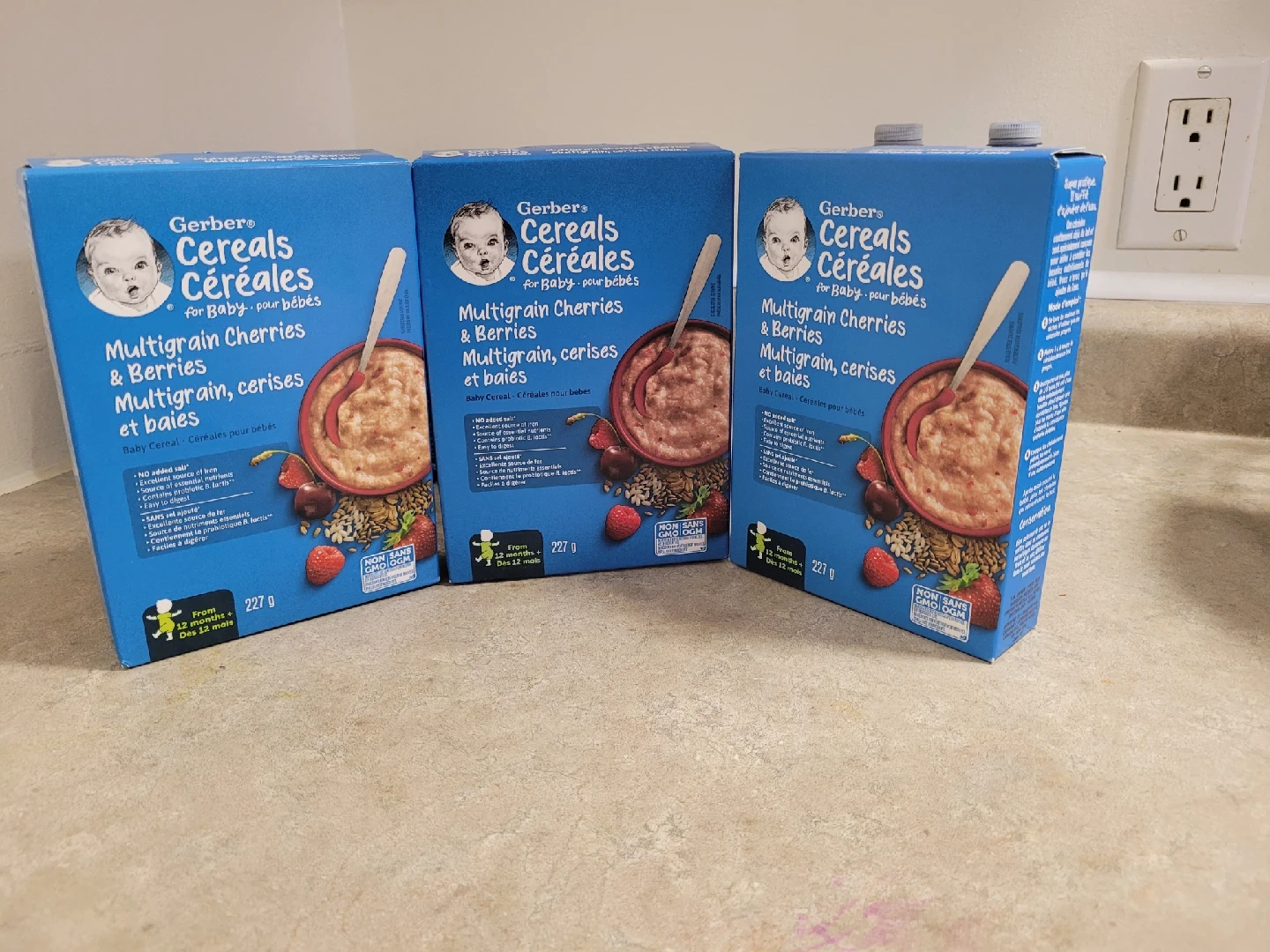 Selling three boxes of Gerber Multigrain Cherries & Berries cereal for babies. These are suitable for babies 12 months and older. Each box contains 227g of cereal. The best before date is December 2026