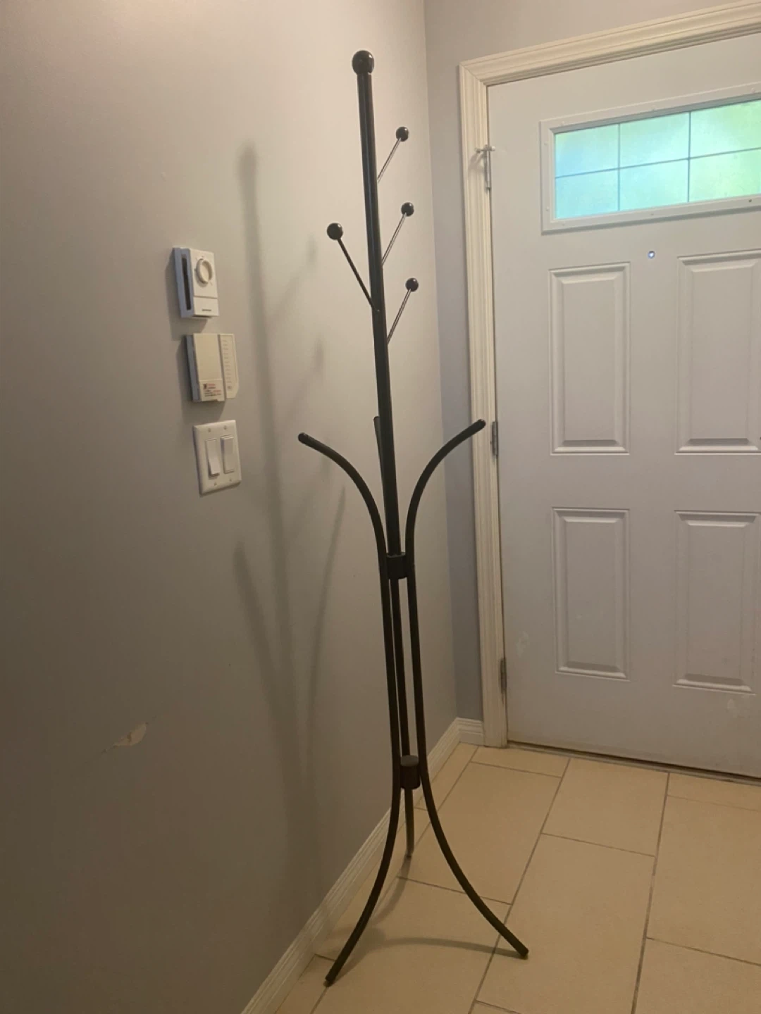 Selling a black metal coat rack in good condition. It's perfect for hanging coats, hats, and scarves in your entryway or closet. It has a sturdy base and a sleek design that will complement any decor
