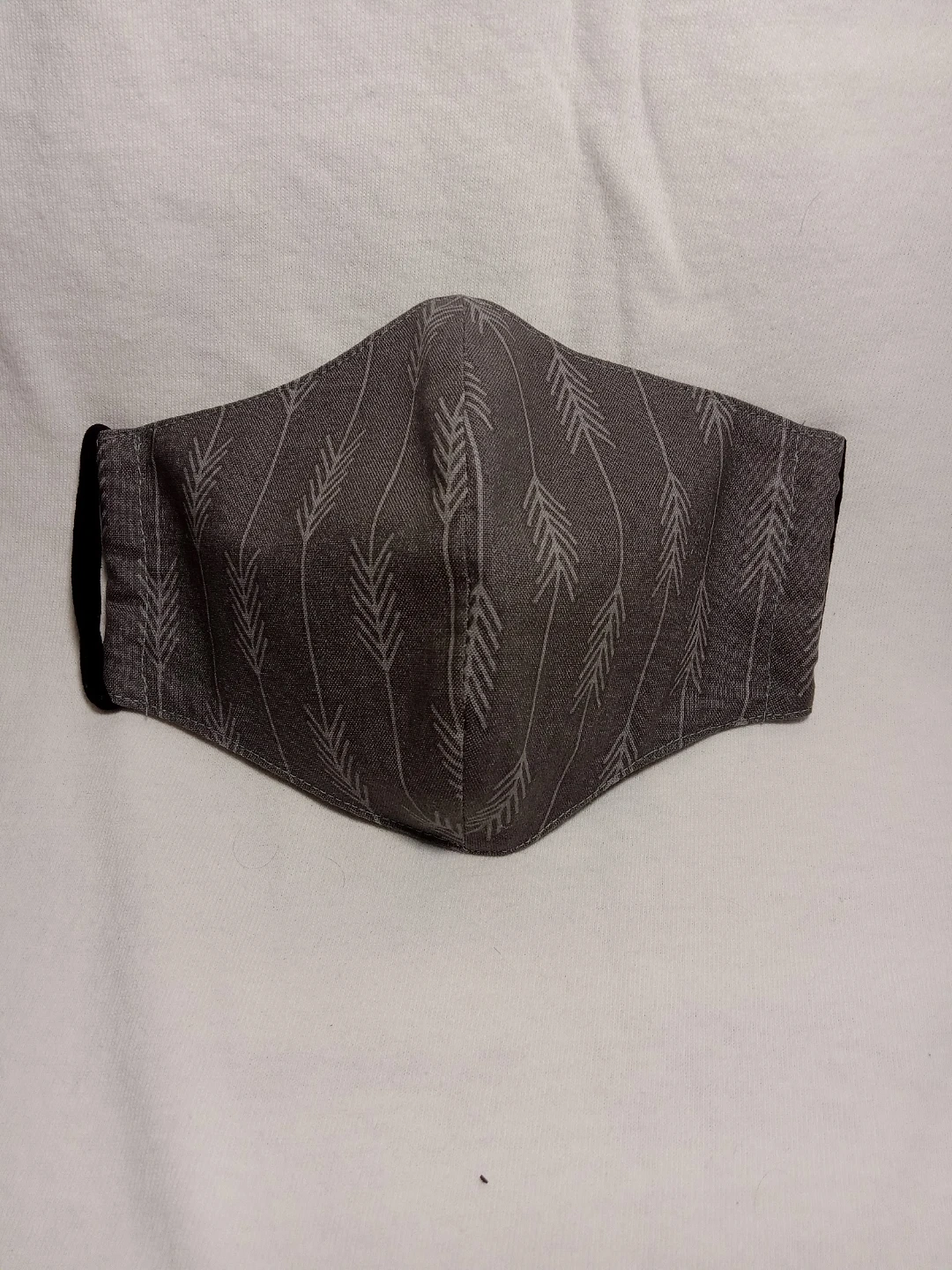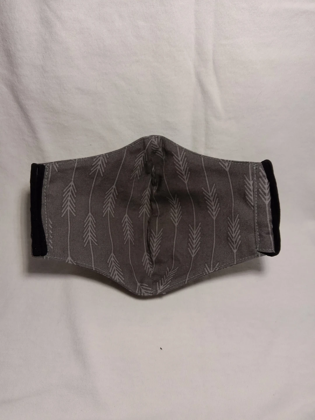 Selling a handmade face mask with a grey background and a white arrow pattern. It's in great condition and never been used.