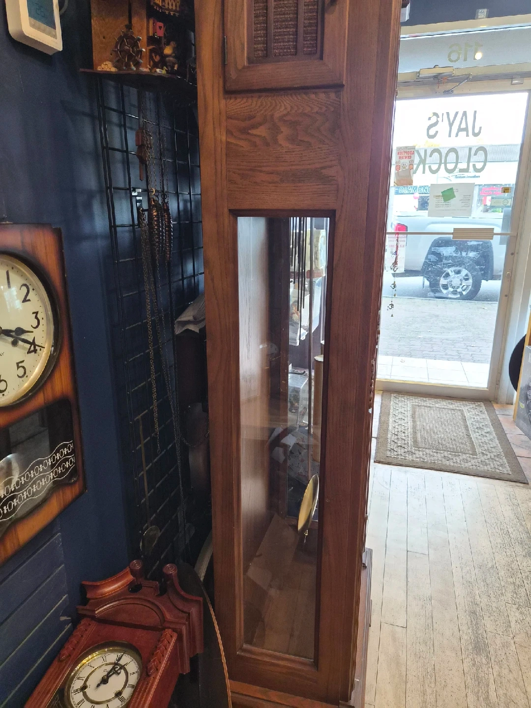Here's a beautiful Ridgeway grandfather clock! It's an elegant piece that would look great in any home. It features a classic design with a wooden frame and a detailed clock face. The clock has a pendulum and weights, adding to its charm and functionality
