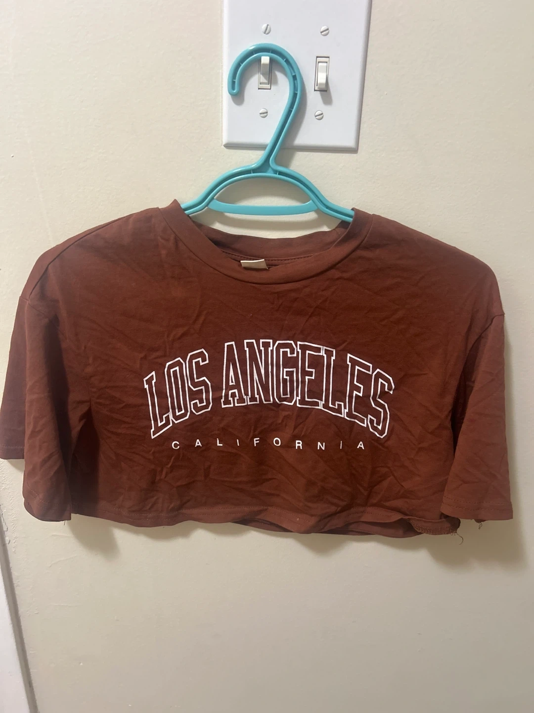 Selling a cute SHEIN Teen crop top in brown! It features a "Los Angeles California" design. The tag says it's a size 10-11Y.