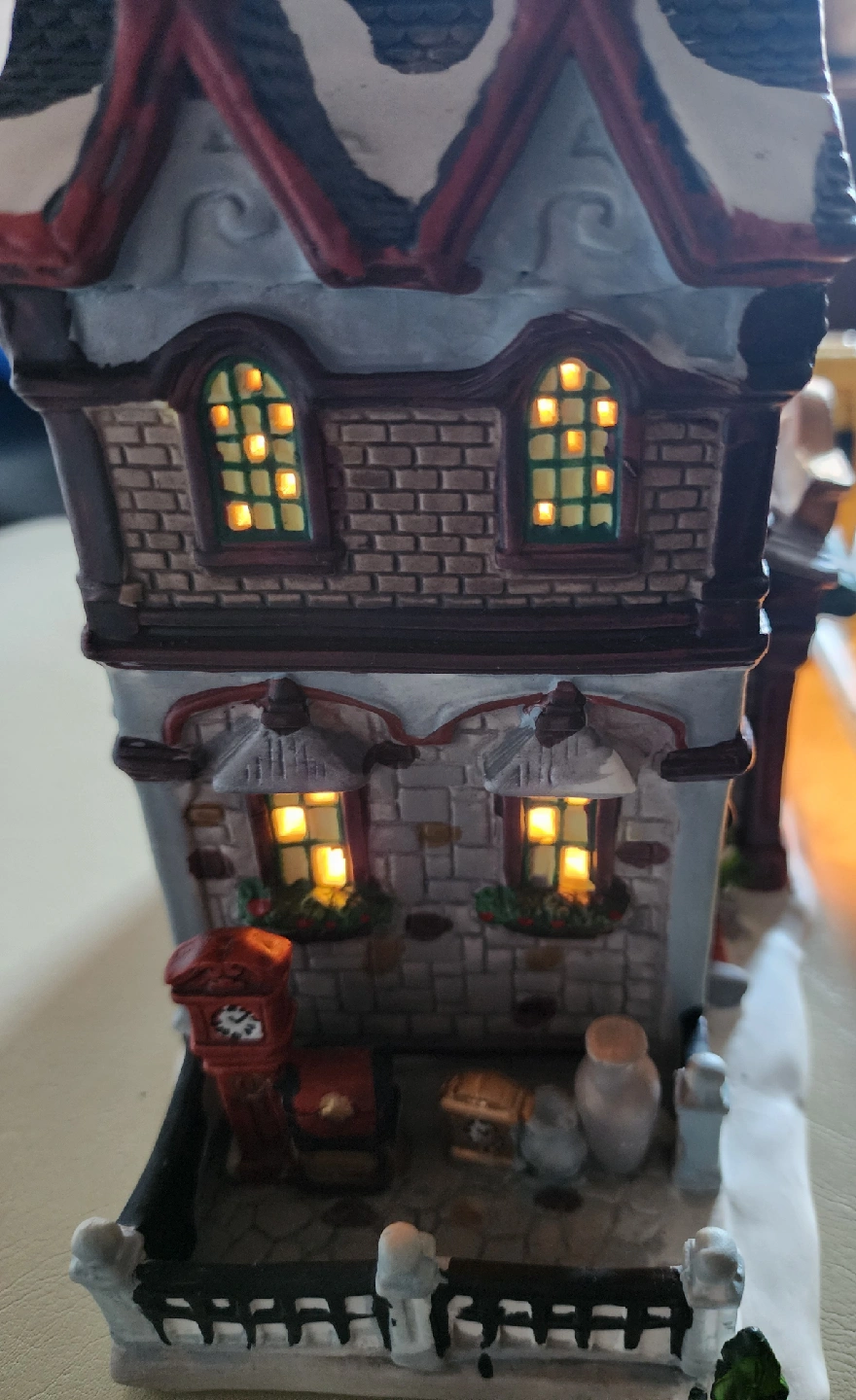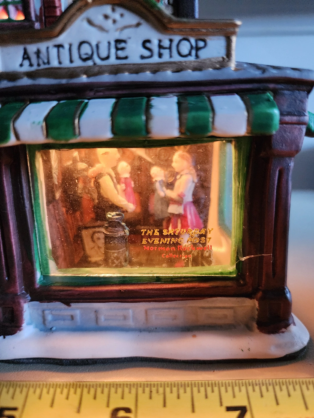 Here's a charming Norman Rockwell collectible village piece! It's an 'Antique Shop' scene from 'The Saturday Evening Post' collection. The piece is in great shape and would look lovely as part of a holiday display or village collection