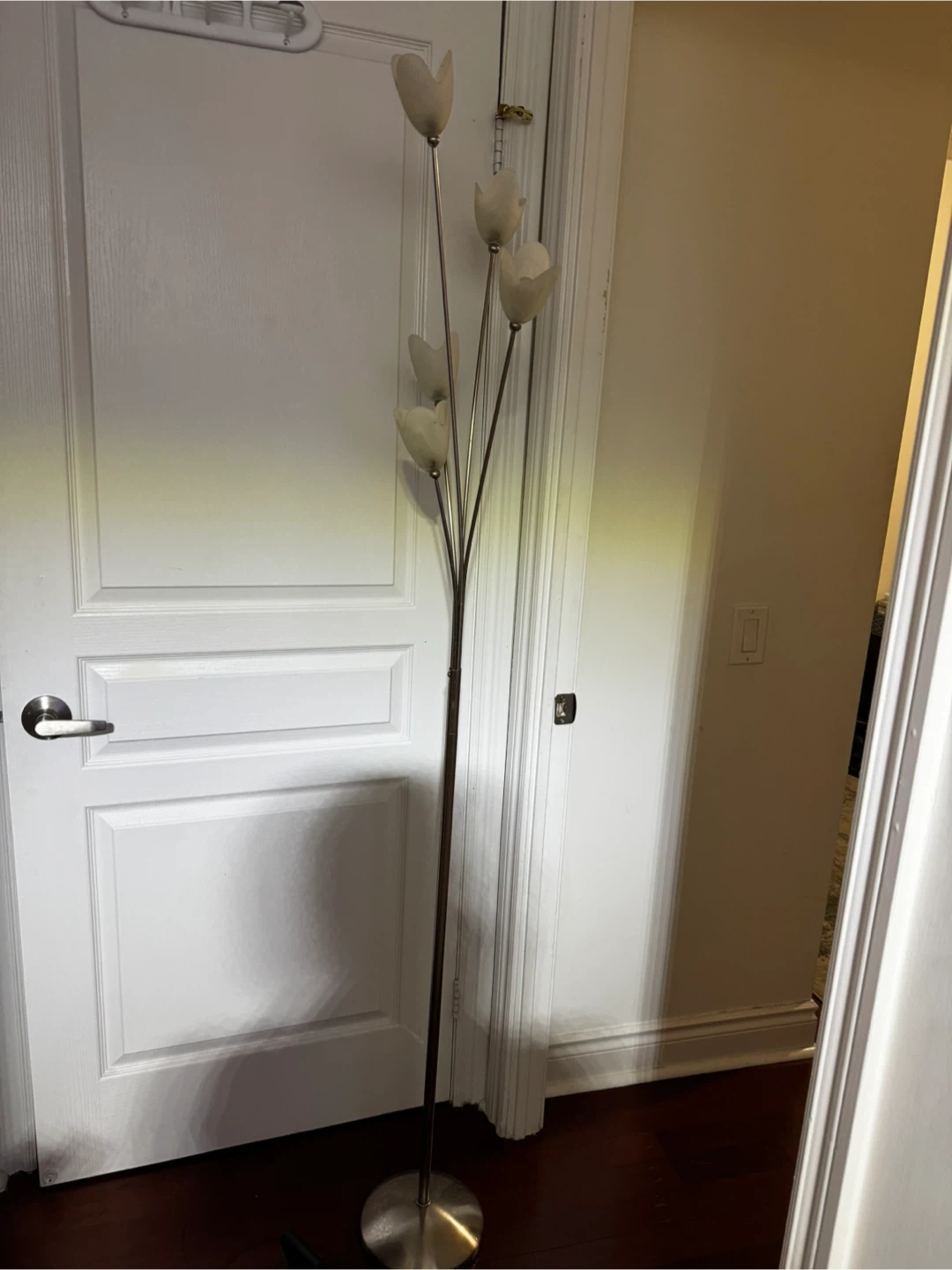 621Unique floral design floor lamp . This lamp stands tall and adds a touch of whimsy to any room, providing a soft, ambient light. It's in good working condition and ready to brighten up your home. Specifications: * Design: Floral tulip theme * Type: Floor lamp * Lighting: Ambient $40 Yonge and finch area