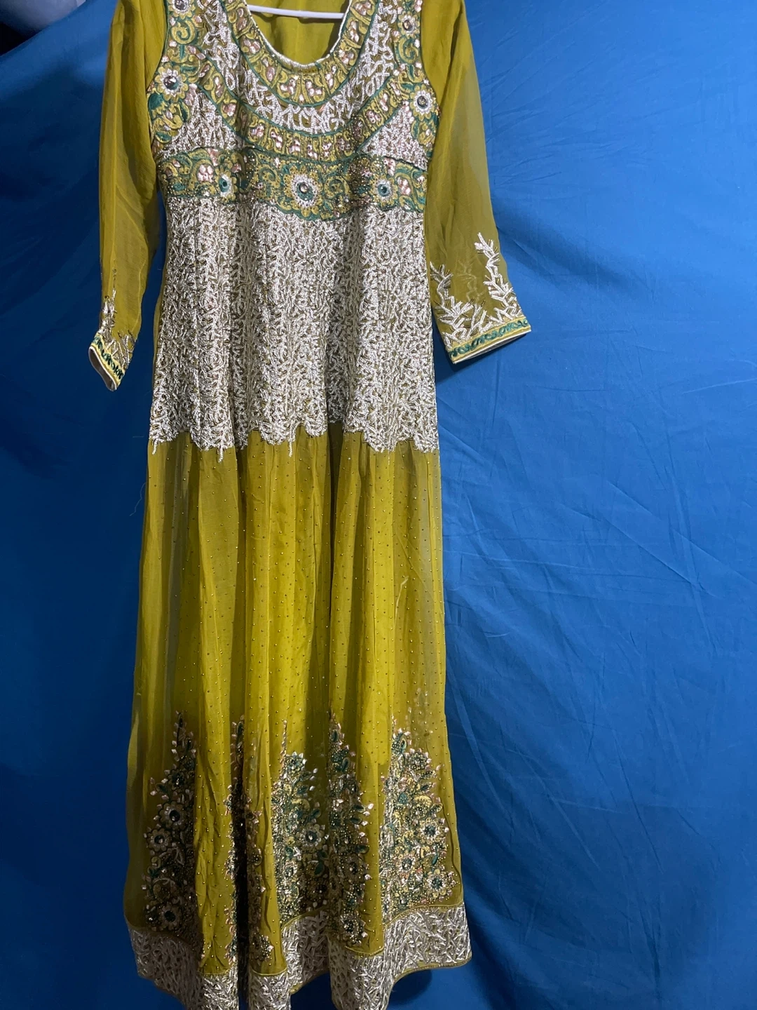 60Beautiful long dress featuring intricate embroidery in green, white, and gold tones. The dress has a flowing design and would be perfect for a special occasion. The material feels lightweight and comfortable. It's in great condition and ready for a new home