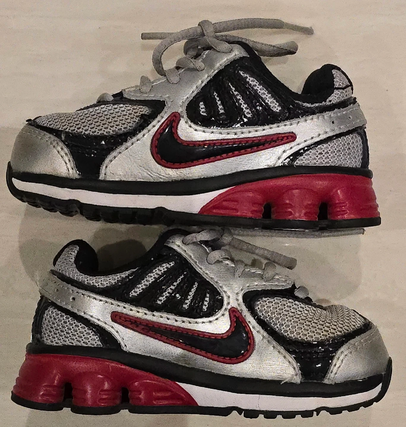 282Selling a pair of cute little Nike kids running shoes! They feature a grey and silver colour scheme with black and red accents. The shoes have the iconic Nike swoosh on the side. Great for active kids! EXCELLENT condition as shown in the photos! Please check our listings for more great items for the whole family! LOTS of LIKE NEW items in EXCELLENT condition and BRAND NEW items with tags! ALL for VERY good prices!!! π