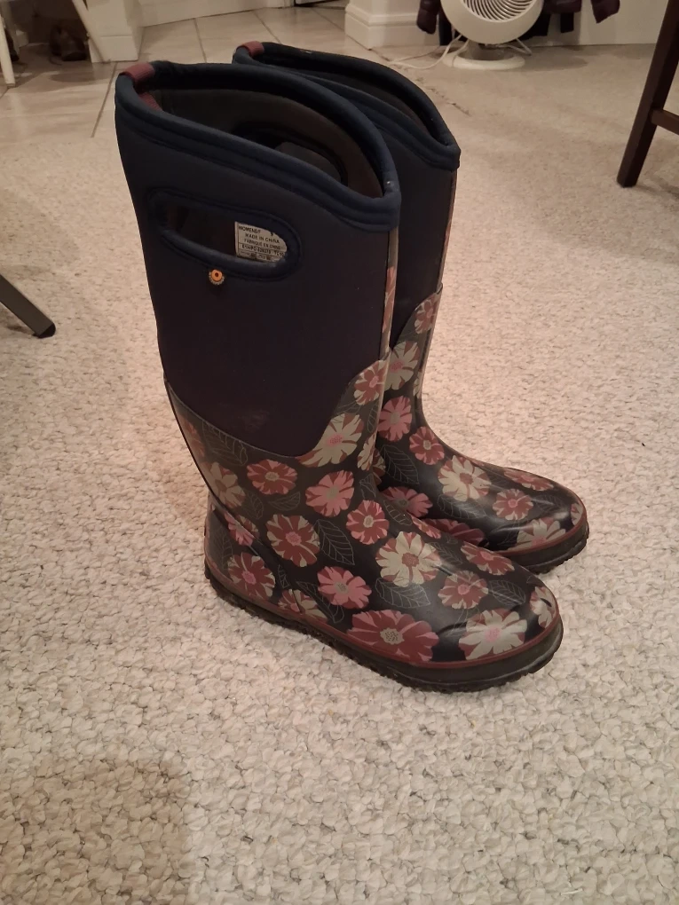 Selling a pair of Bogs women's waterproof boots, size 9. They have a cute floral pattern and are in great condition for keeping your feet dry and warm! Worn a few times.