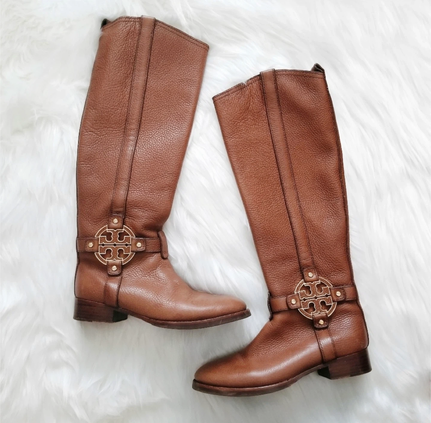Selling a pair of Tory Burch riding boots in a lovely brown leather! They feature the classic Tory Burch logo on the side. The soles show some wear, but they're still in great shape for hitting the town or the stables!