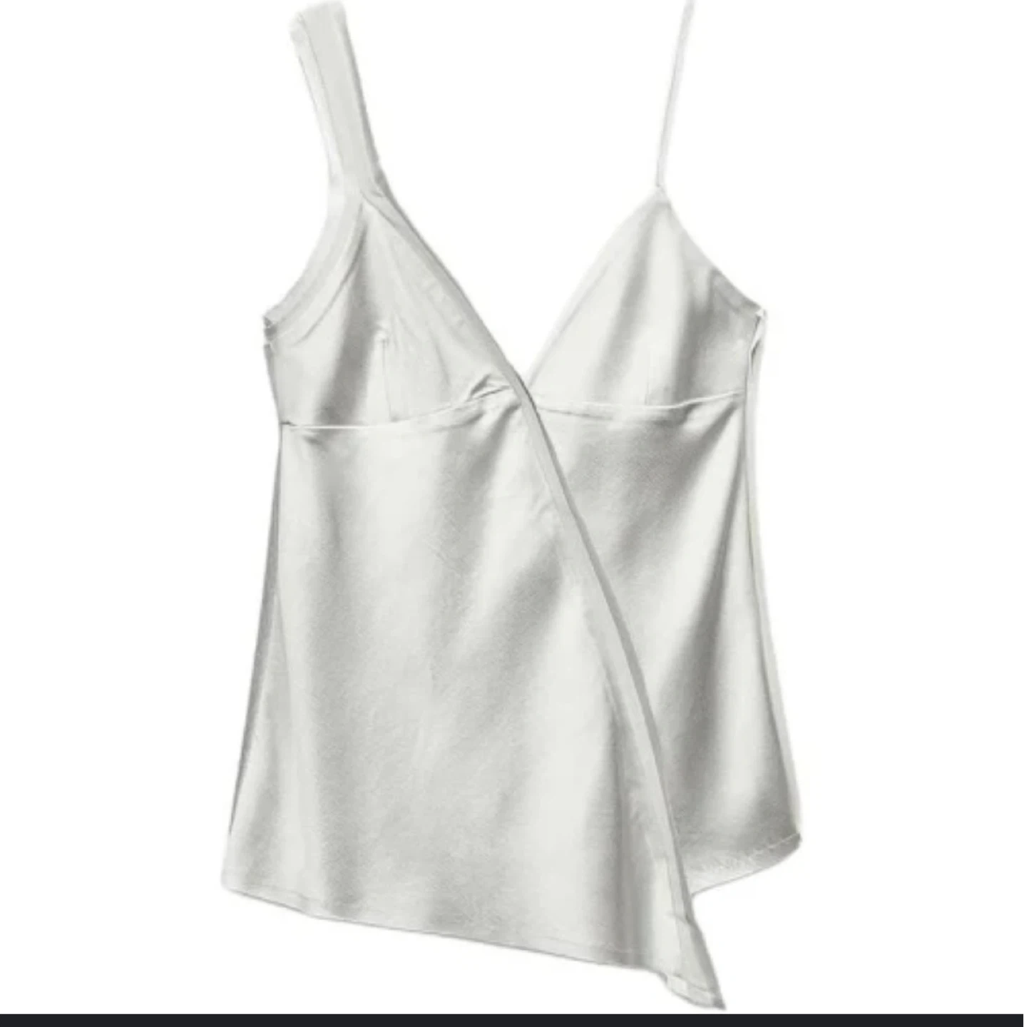 Selling a stylish white cami top with an asymmetrical design! It's in great condition and perfect for dressing up or down. The silky material gives it a lovely drape