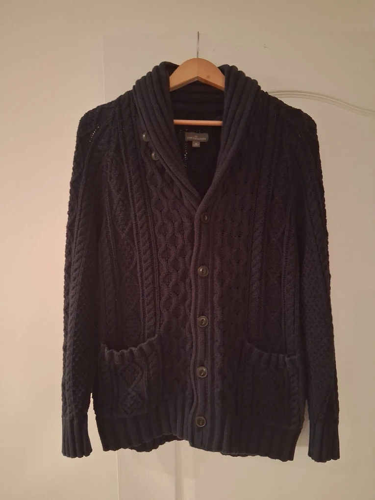 Cozy LL Bean Signature cardigan with a stylish shawl collar! This navy blue cardigan features a classic cable knit design and button-up closure. It has a comfortable fit and is perfect for layering during cooler weather. Size is medium.