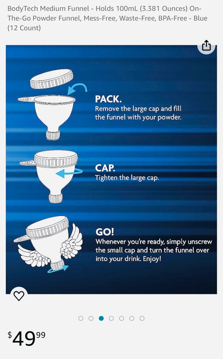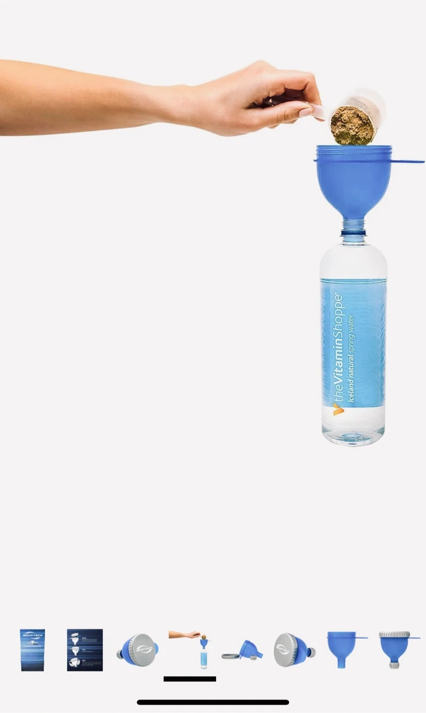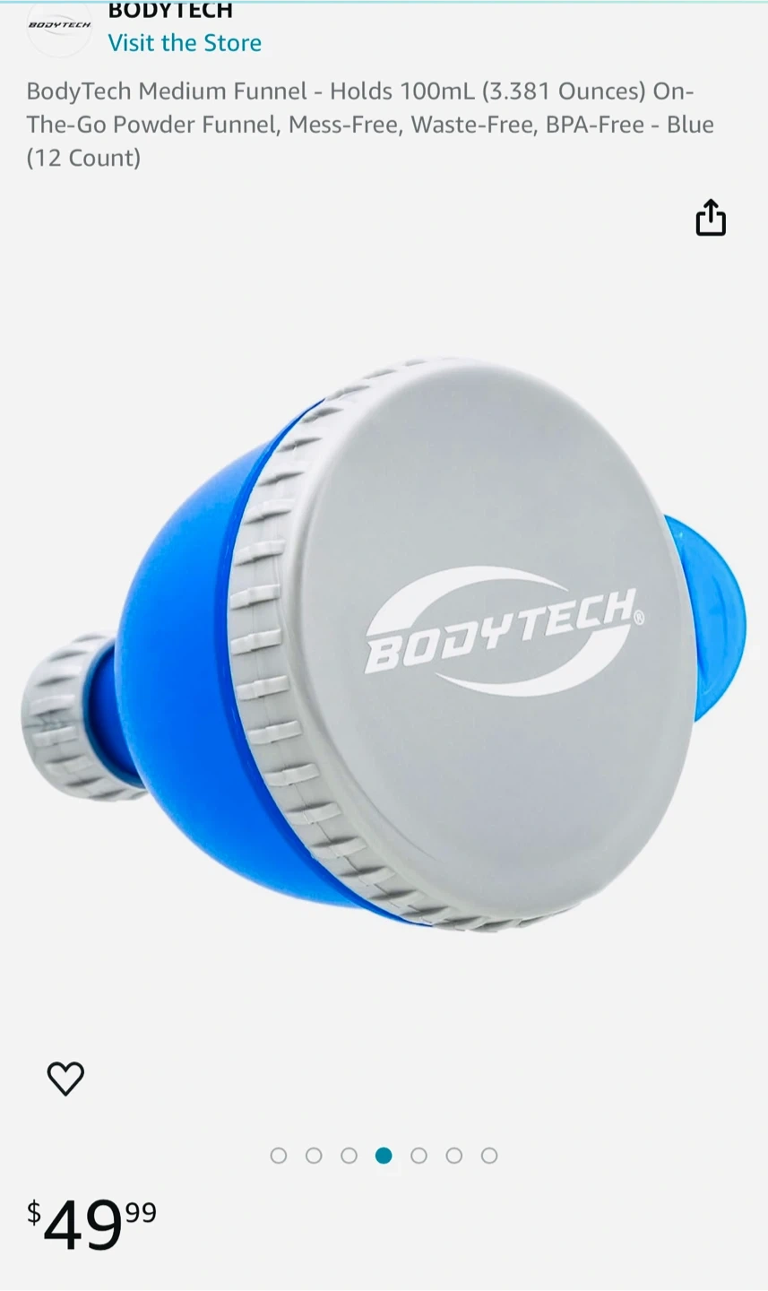 Selling a BodyTech medium funnel, perfect for on-the-go powder mixing! It holds 100ml (3.381 ounces) and is mess-free, waste-free, and BPA-free. It's a convenient blue color and originally retailed for $49.99