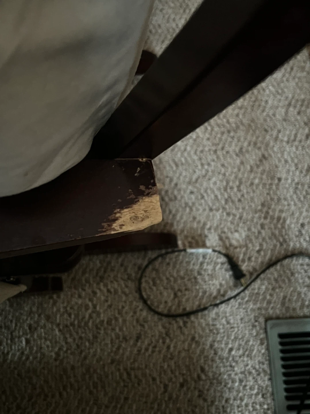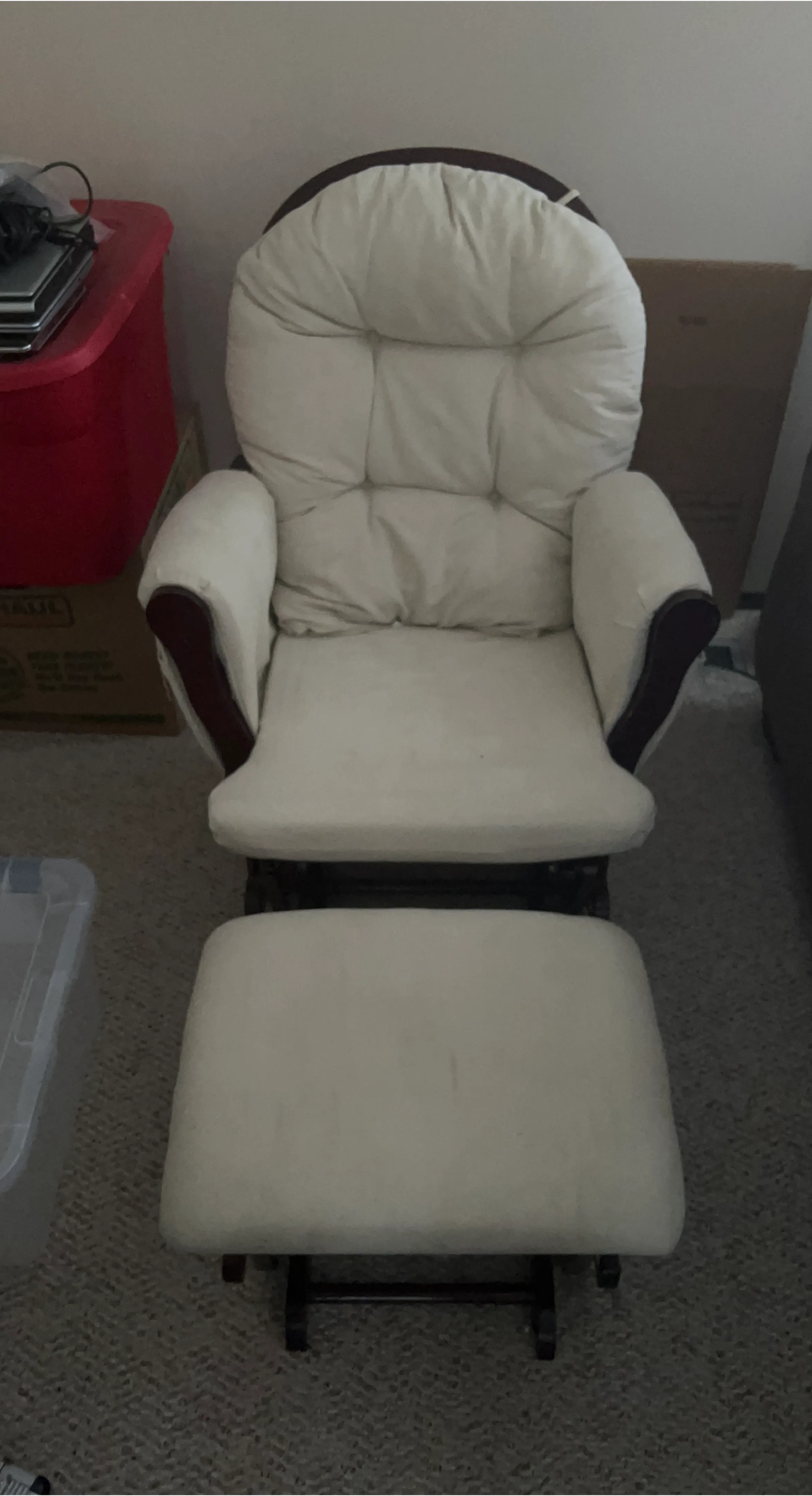 Selling a comfy glider rocking chair with a matching ottoman! It's perfect for relaxing and would be great in a nursery. It has a cream-colored cushion and dark wood accents. There are some signs of use on the cushion, but it's still in good condition and ready for a new home