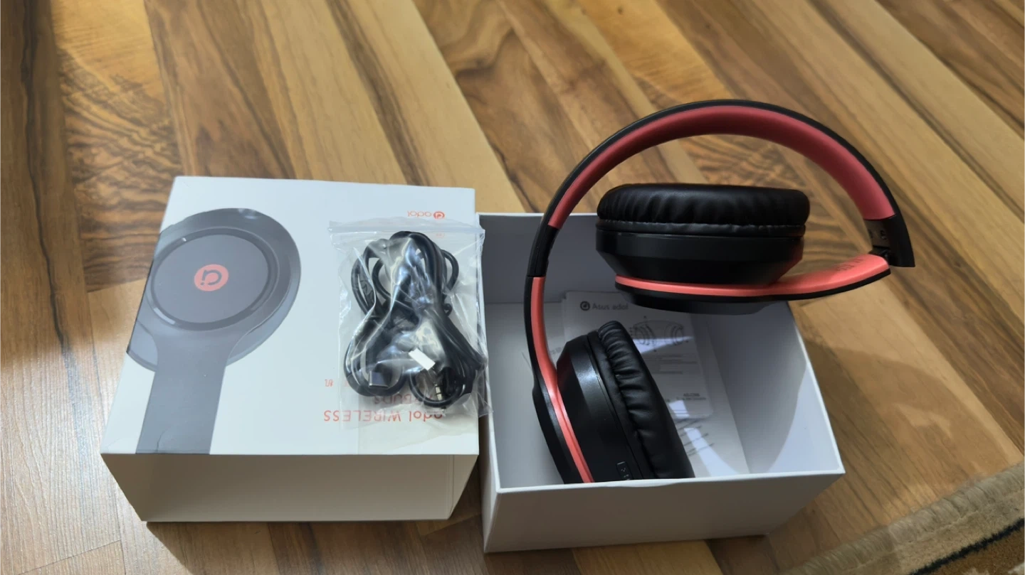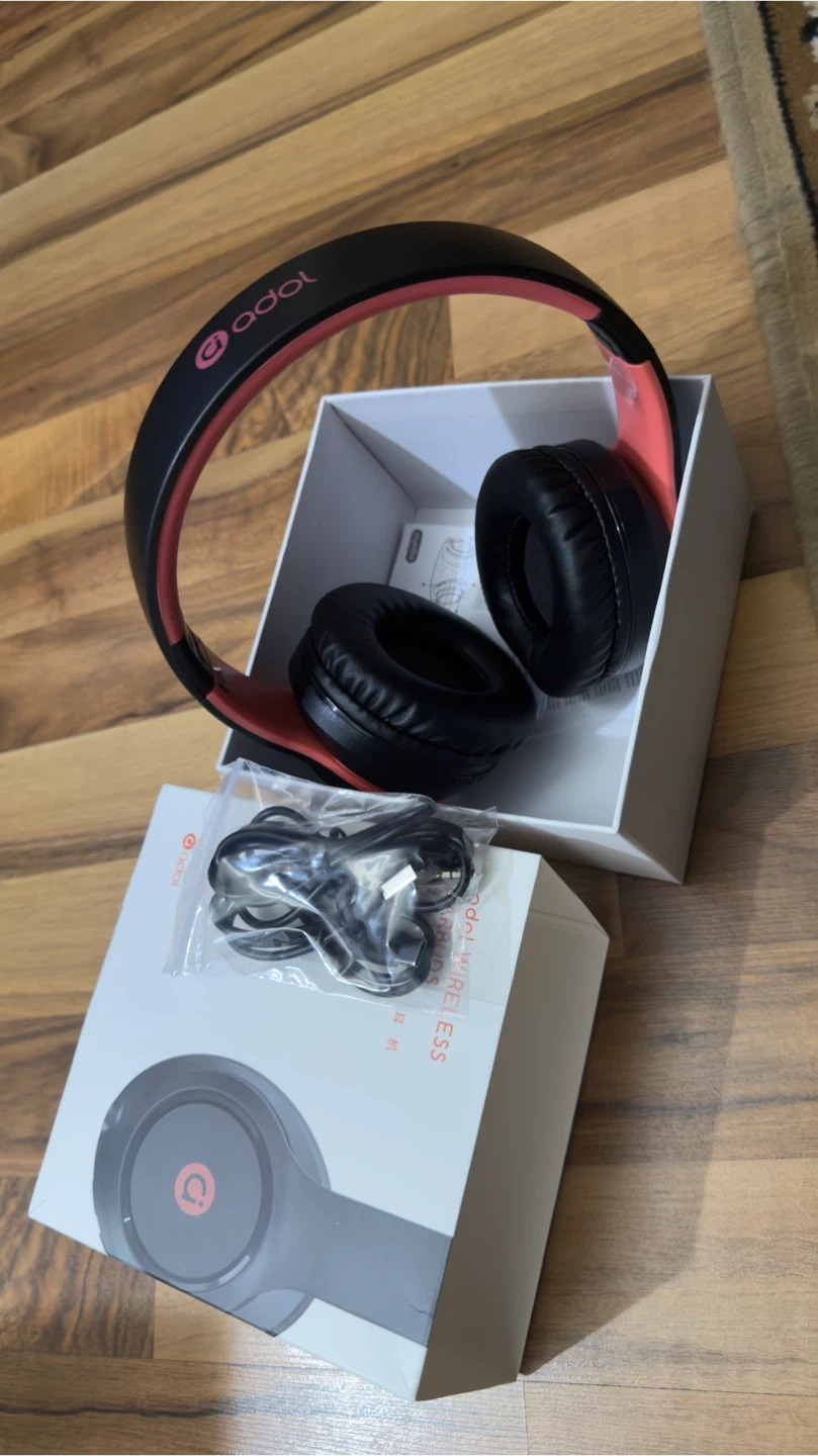 Selling a pair of Adol wireless headphones in black and coral! They come with the original box and included components like the charging cable and instructions. Perfect for listening to your favourite tunes on the go