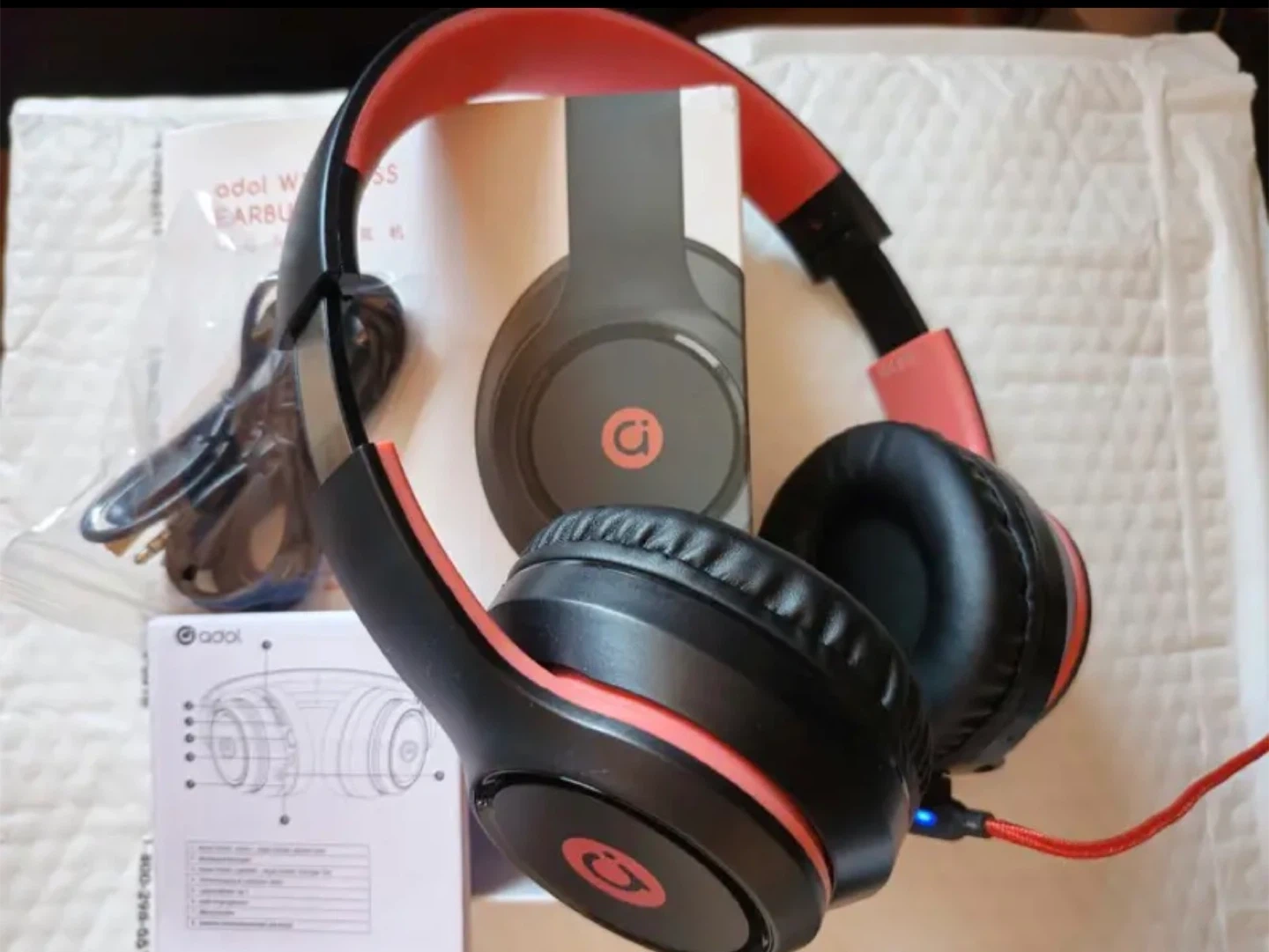 Selling a pair of Adol wireless headphones in black and coral! They come with the original box and included components like the charging cable and instructions. Perfect for listening to your favourite tunes on the go