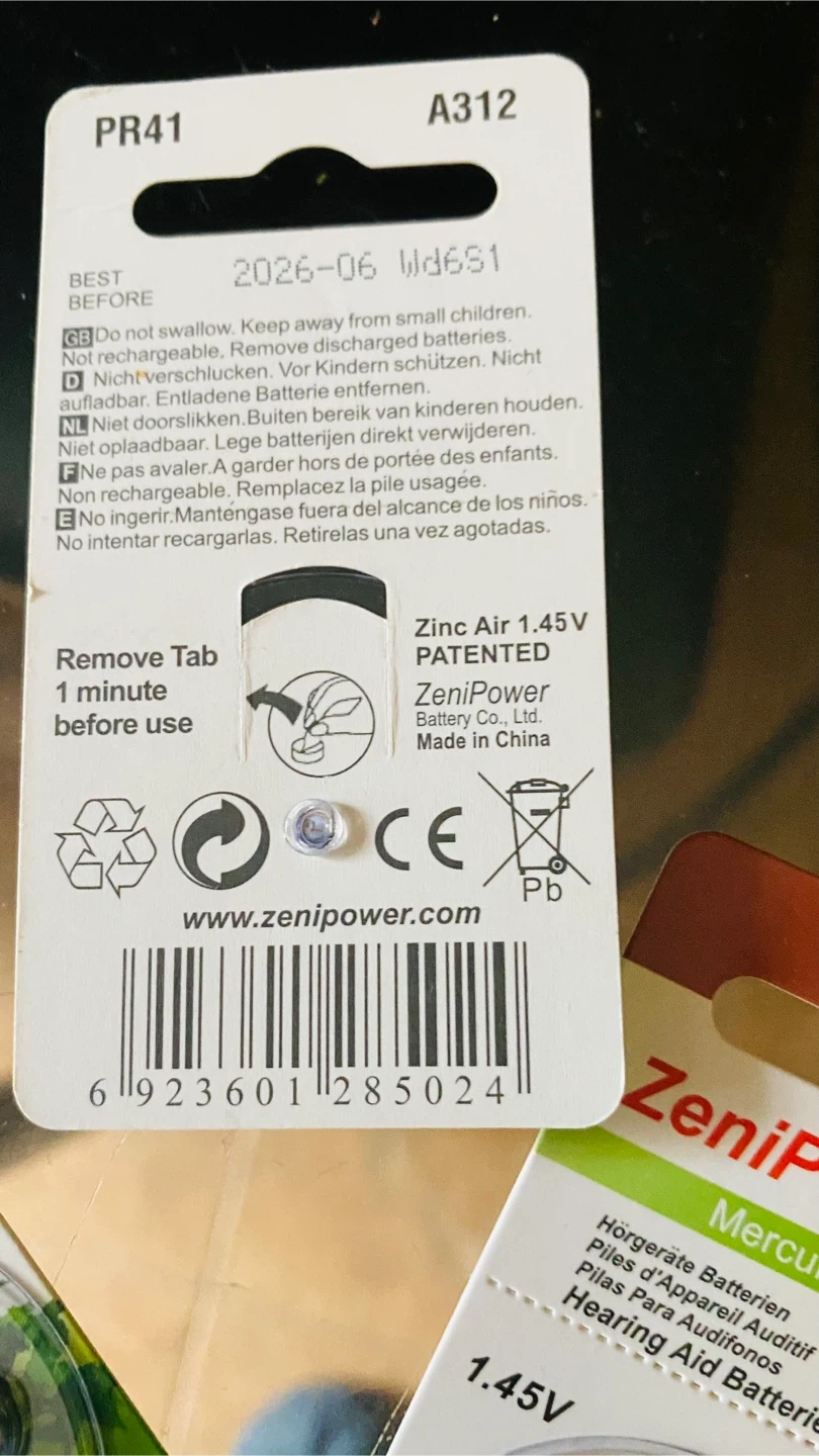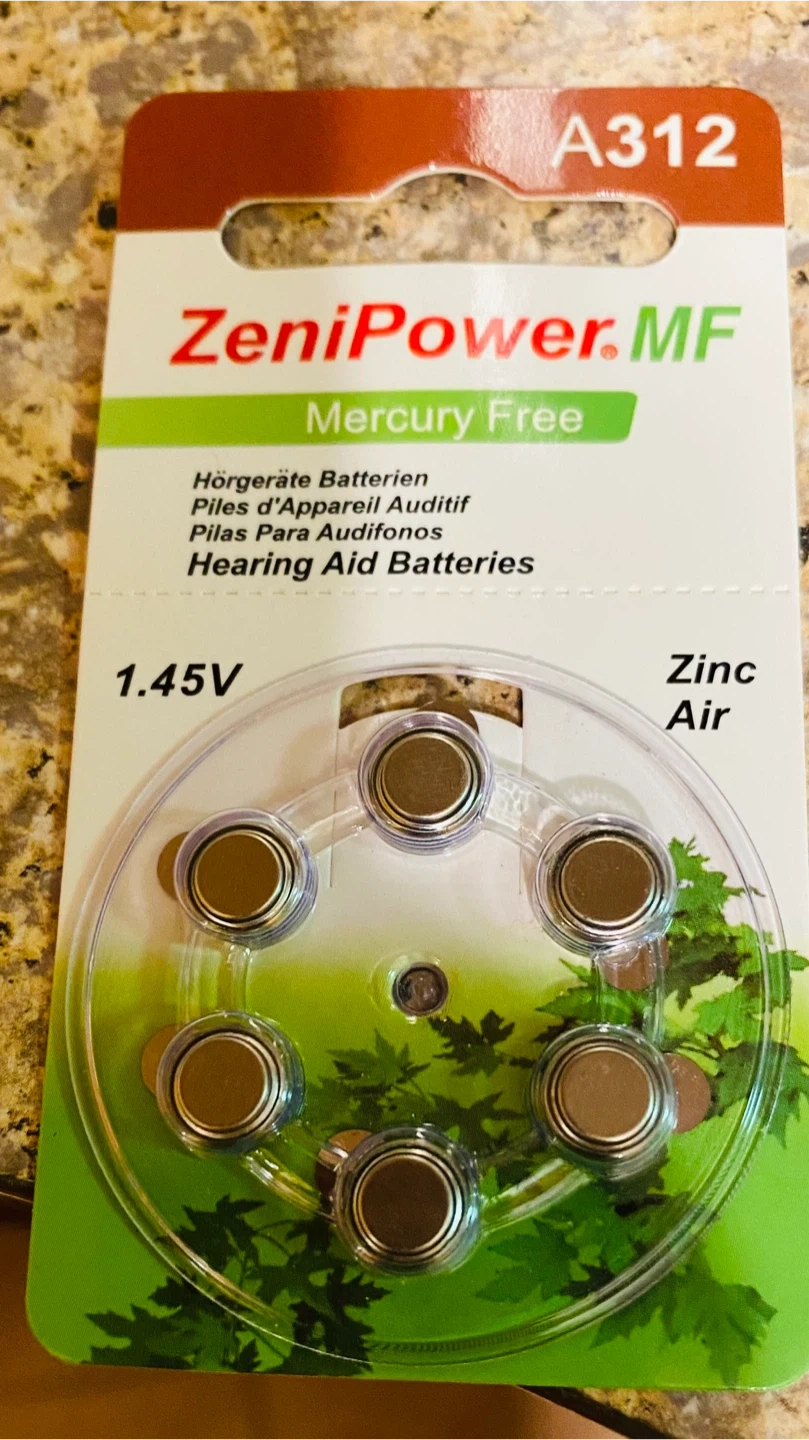 I'm selling new ZeniPower MF A312 hearing aid batteries! They are mercury-free and 1.45V. These batteries are zinc air and come in packs of six. The expiration date is June 2026