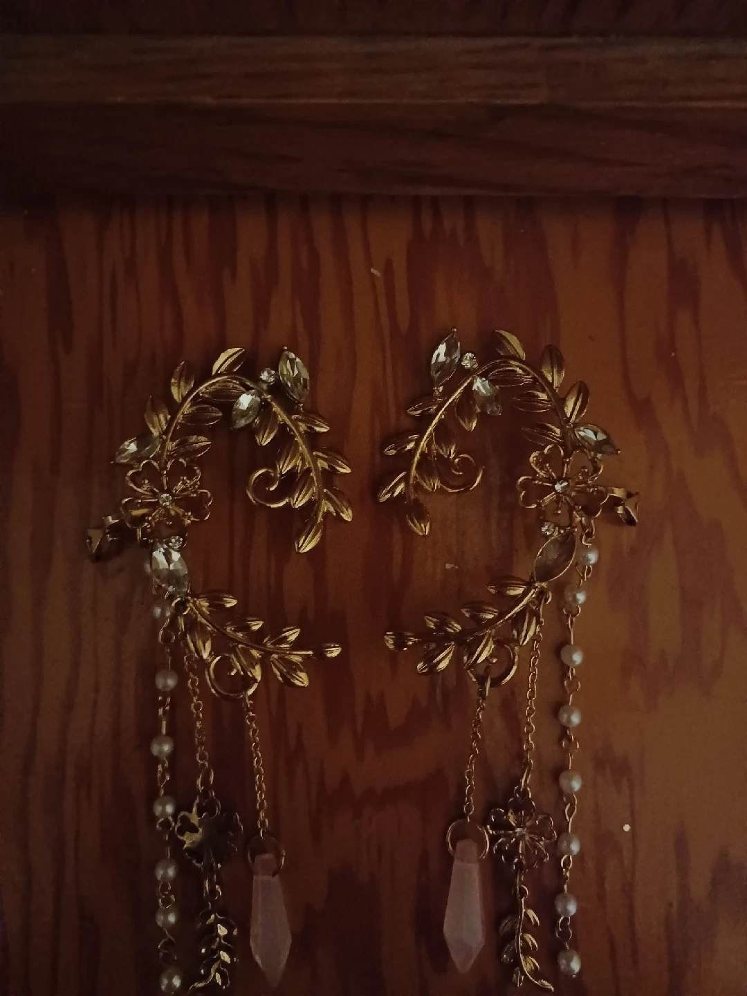 These gold-tone earrings feature a beautiful floral and leaf design with dangling accents. They have a unique and elegant look that would add a touch of sparkle to any outfit. Perfect for dressing up or adding a little flair to your everyday style!