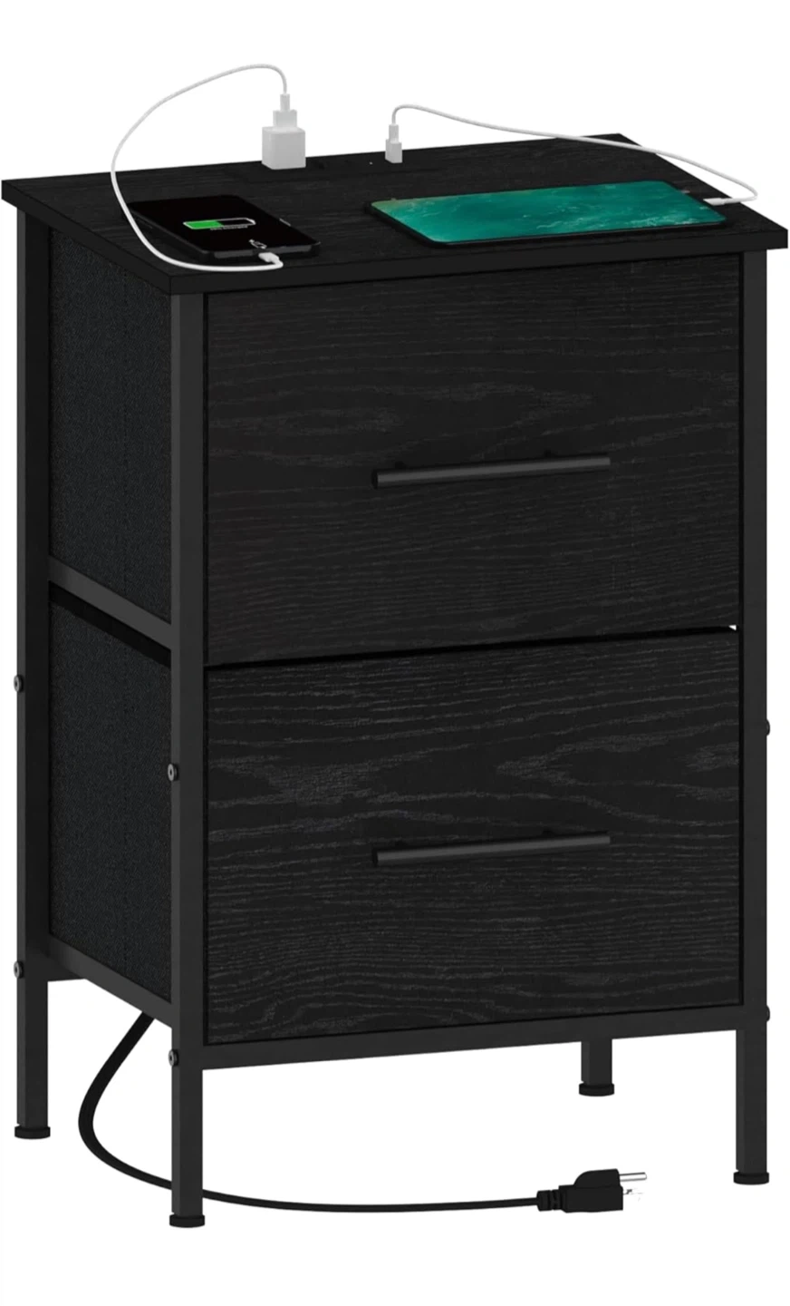63This SANGMUCEN nightstand is perfect for keeping your devices charged and your bedside organized! It features a built-in charging station with 2 AC outlets, 1 USB port, and 1 Type C port. The nightstand also has two large wooden drawers for storage. It measures 11.8"D x 15.7"W x 24"H and has a capacity of 37.5 lb per drawer. The total capacity is 154 lb