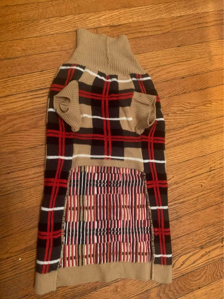 Adorable plaid turtle neck sweater. In perfect condition other then the hole I cut for the leash to go through and attach to the collar so that the turtle neck could still be on the dogs neck properly! Size says XL although it fits a medium dog perfectly such as a beagle.
