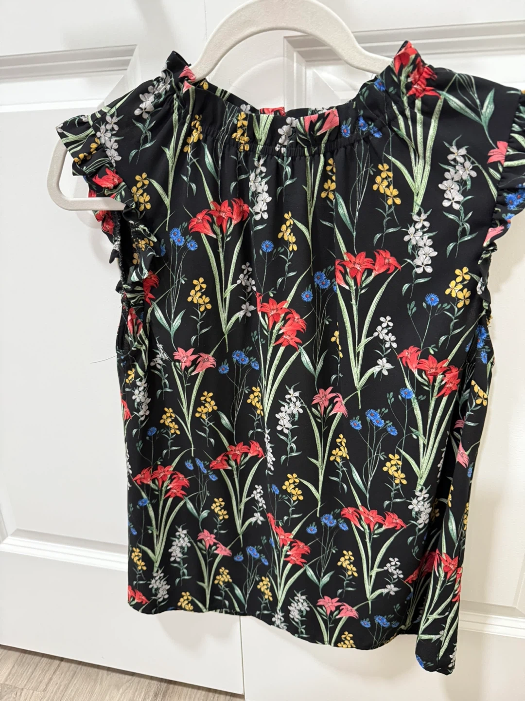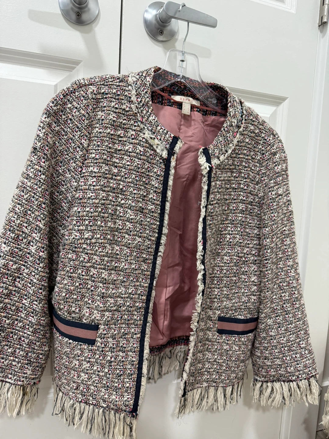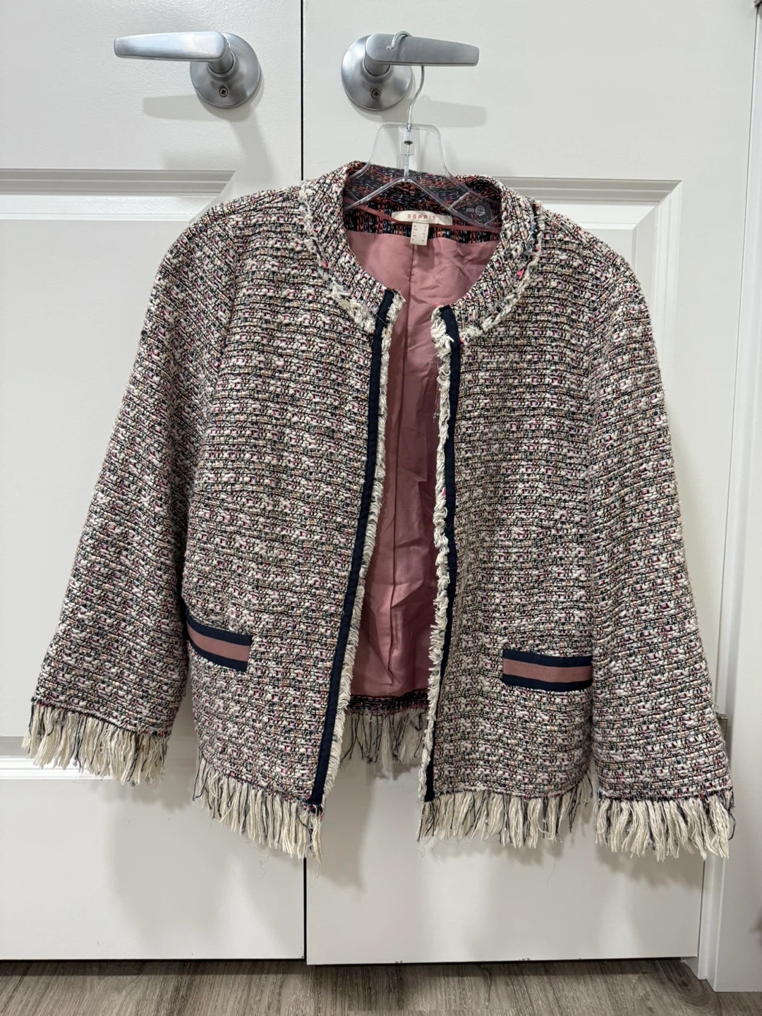 I'm selling a collection of women's clothing. There is a black dress, a green jumpsuit, a tweed jacket, a pink and white striped top, and a black floral top. All items are in great condition!