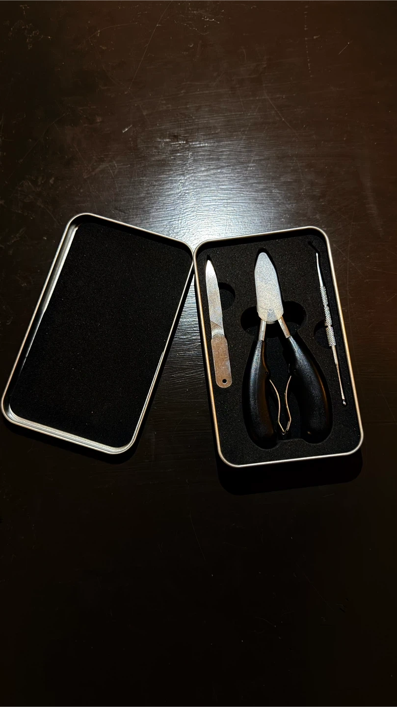 I'm selling a handy nail clipper set! It comes with a nail file, cuticle pusher, and nail clipper, all neatly stored in a case. Perfect for keeping your nails looking their best on the go