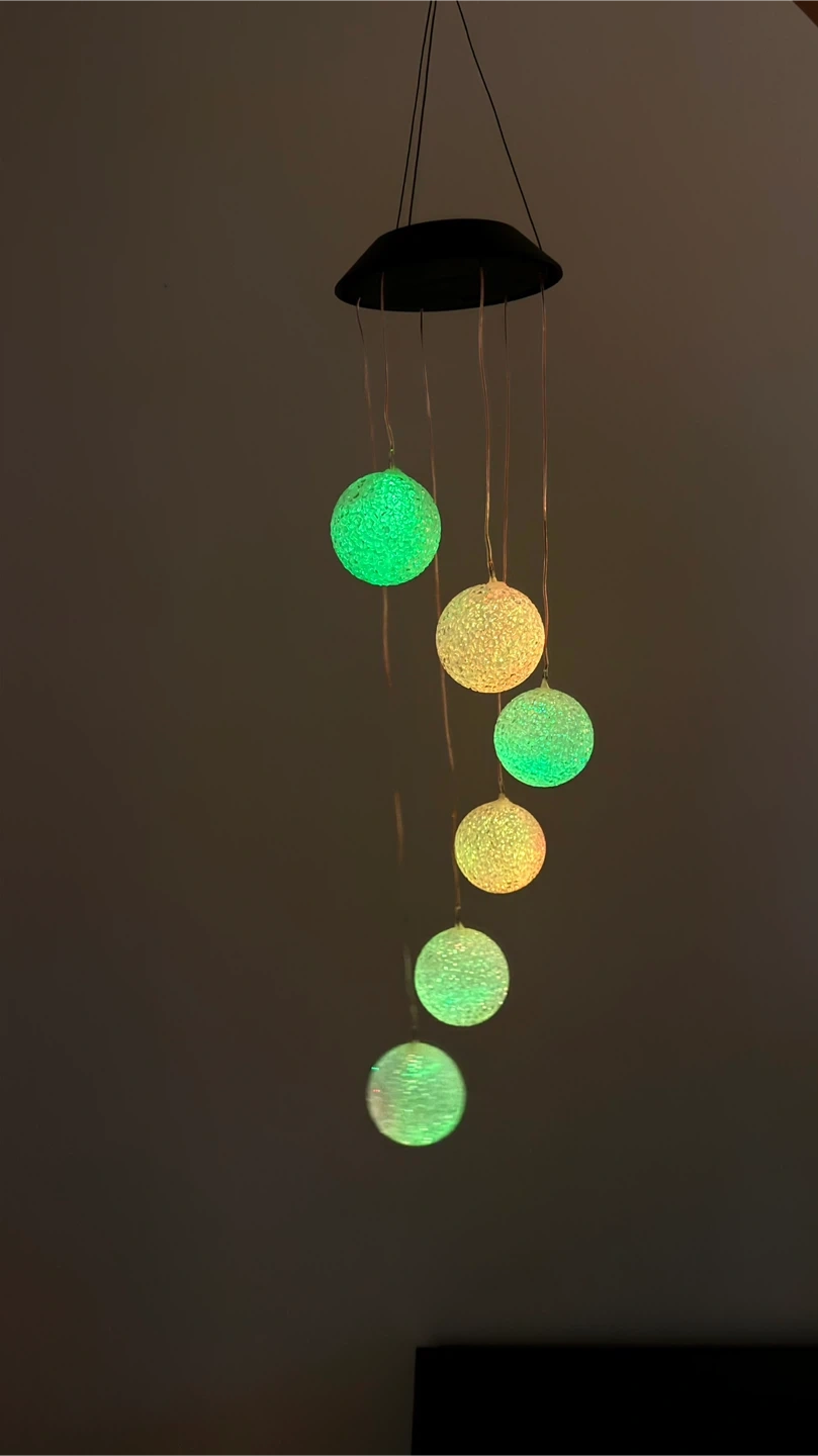 Add a touch of whimsy to your outdoor space with this colour-changing solar-powered mobile! It features several glowing orbs that cycle through different colours, creating a lovely ambiance. Perfect for a patio, garden, or balcony