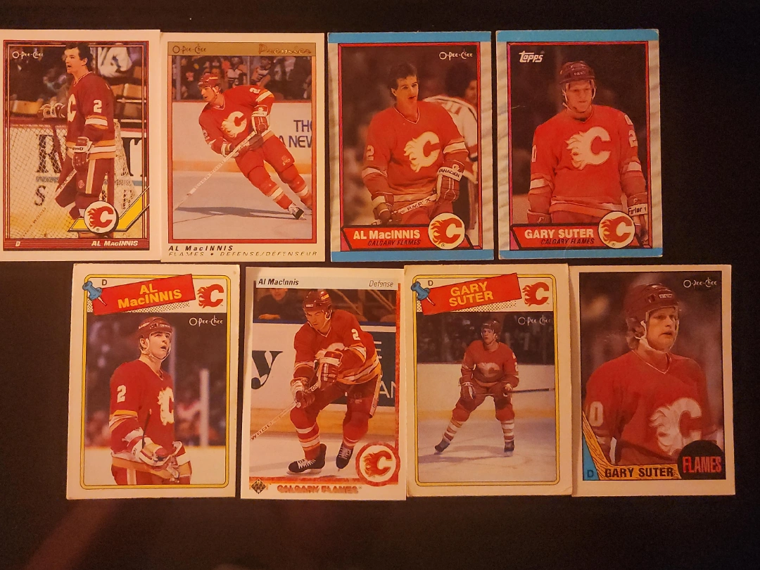 Selling a collection of vintage hockey cards featuring Al MacInnis and Gary Suter of the Calgary Flames. These cards are from the late 80s/early 90s and would be a great addition to any hockey card collection!