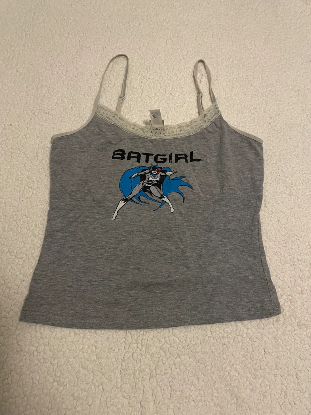 Selling a cute DC Comics Retro Batgirl tank top! It's a size medium and features a grey colour with a Batgirl graphic. The top has a lace trim around the neckline.