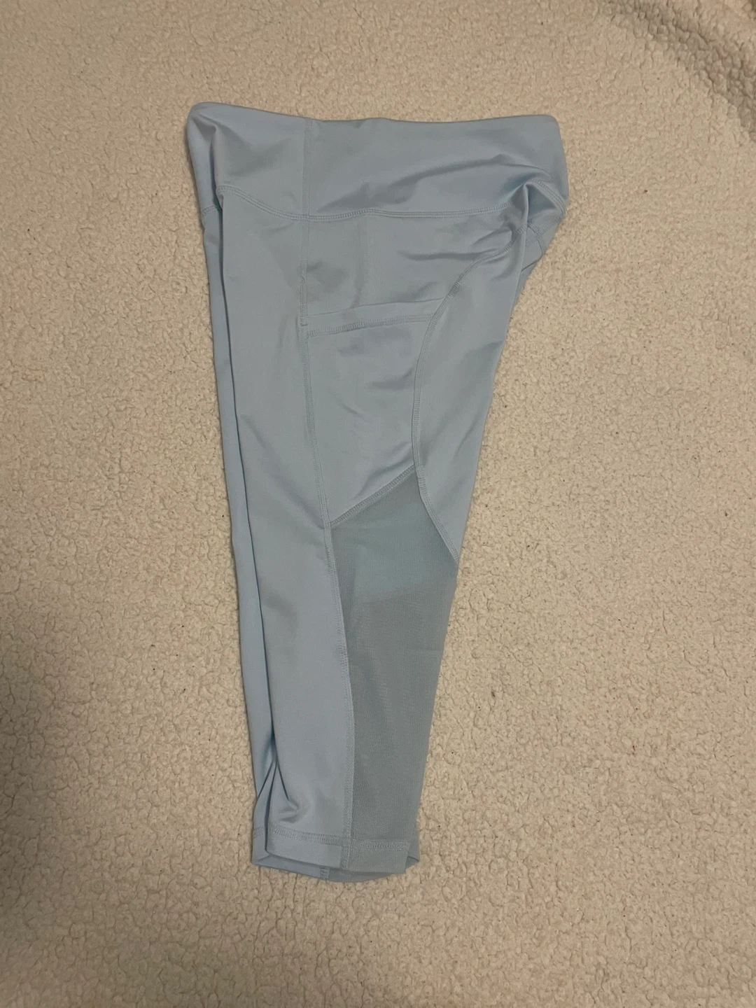 These light blue athletic leggings are perfect for your workouts! They feature a comfortable and stretchy material, with convenient side pockets for your phone or keys. The design includes a mesh panel detail on the lower leg. They are in great condition and ready for a new home!