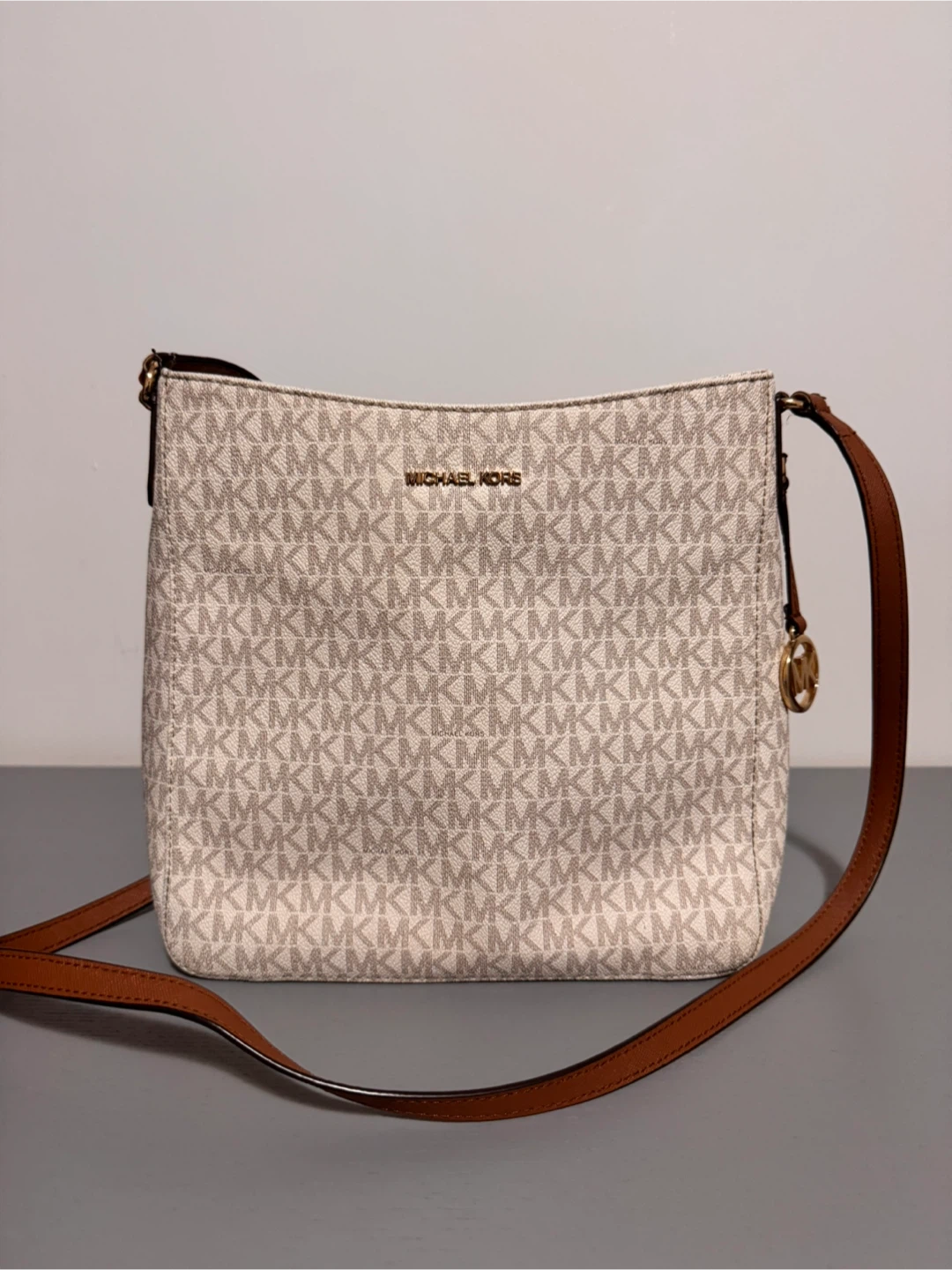 This Michael Kors shoulder bag features the iconic MK signature pattern. It has a classic design with a brown leather strap and gold-tone hardware. This bag is perfect for everyday use.