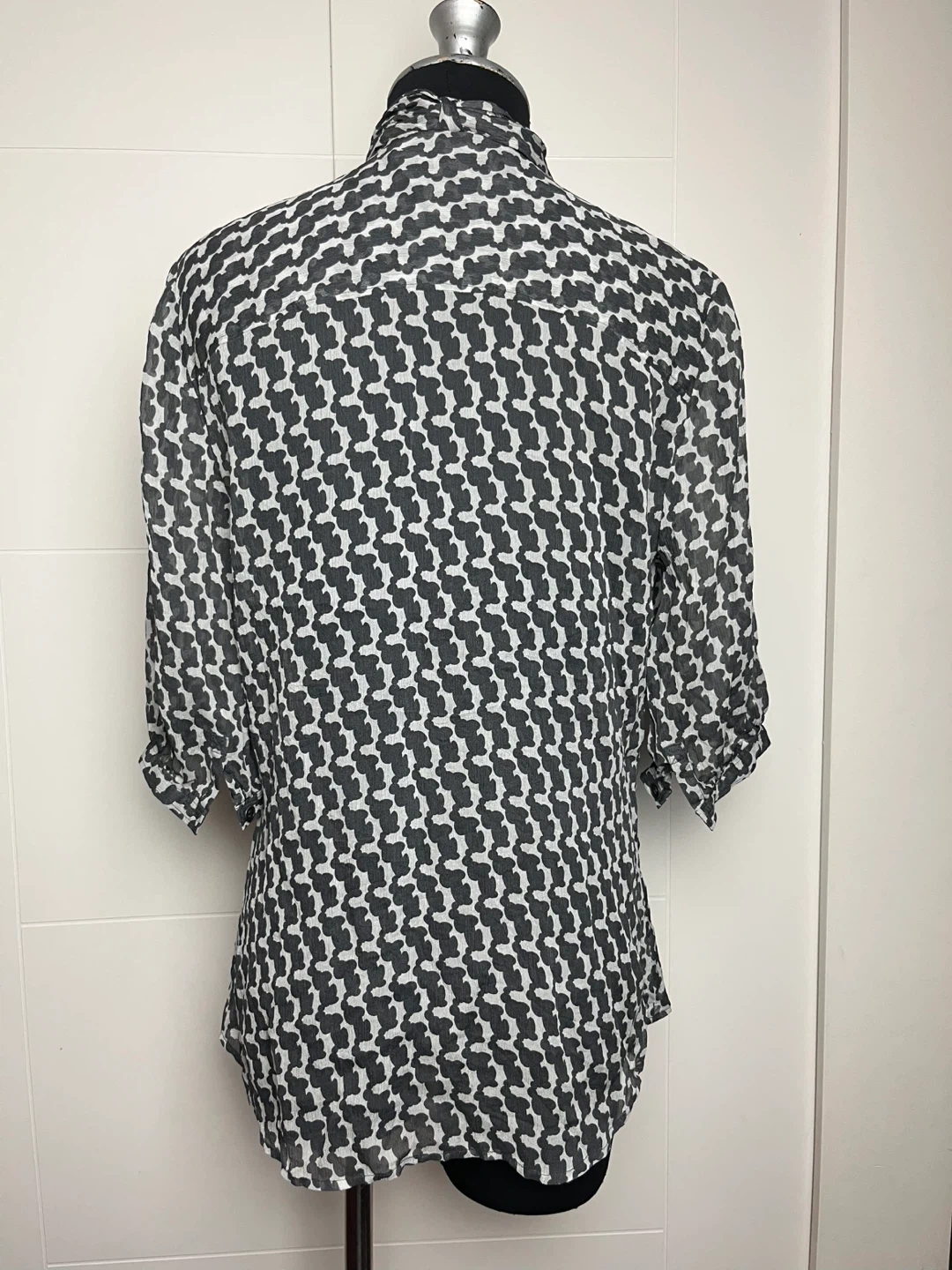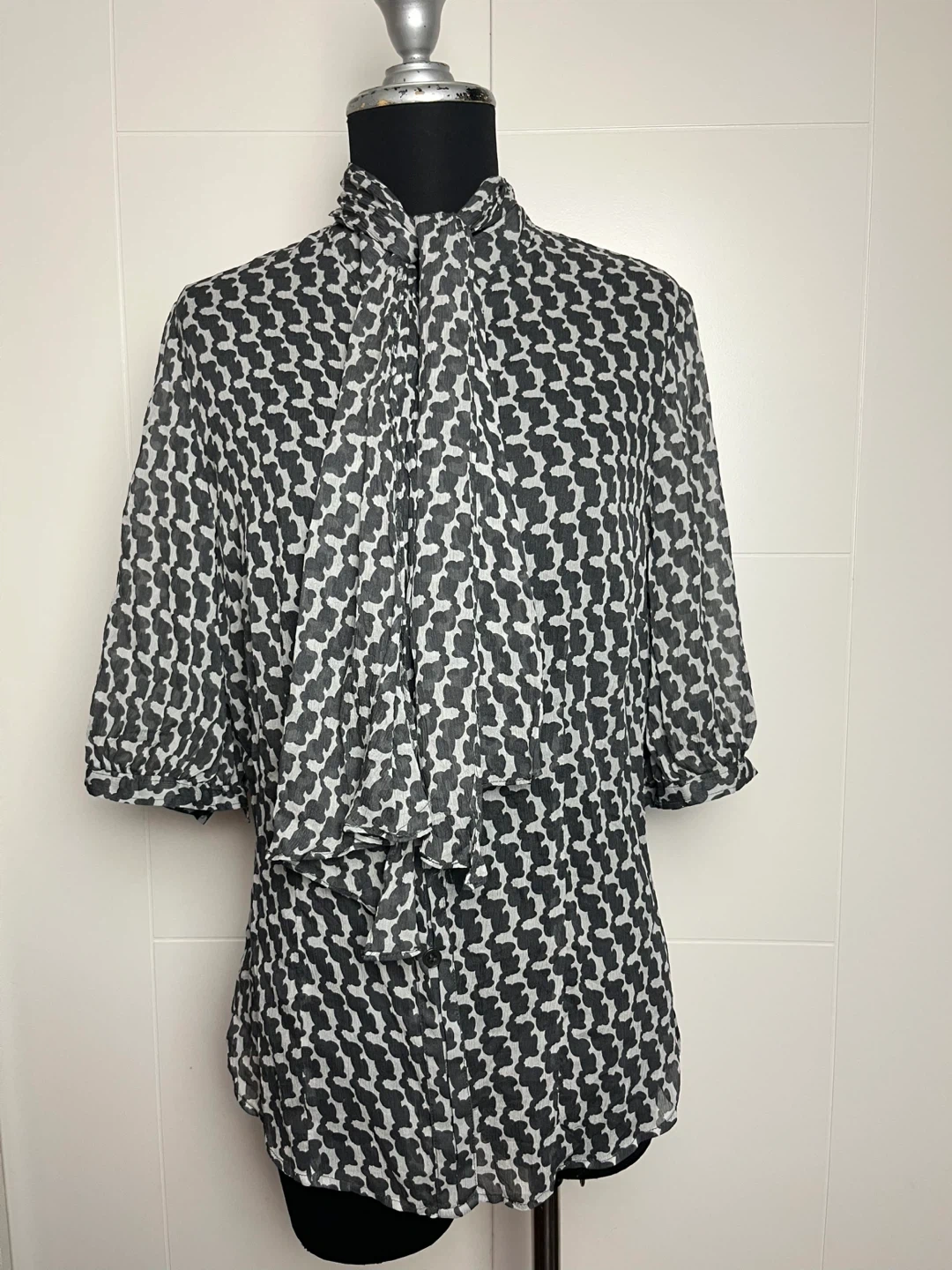 Selling a Club Monaco blouse with a unique black and white pattern. It features a stylish design and is in great condition. Perfect for adding a touch of elegance to your wardrobe!