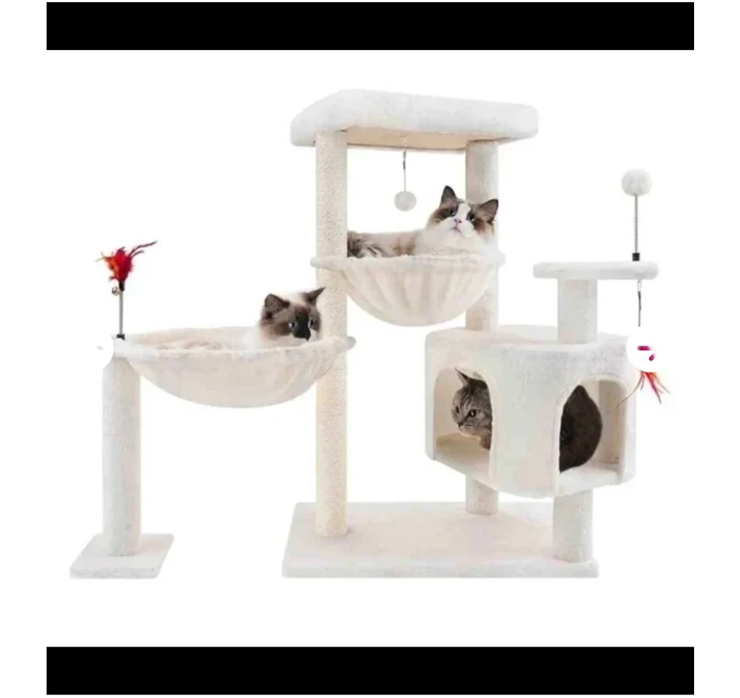 - The YOUPET 33.46" Cat Tree Tower is a cozy and entertaining activity center designed for indoor cats of all sizes. This beige cat tower features a spacious cat condo for private naps, two large soft hammocks for lounging, and multiple scratching posts to keep claws healthy while protecting your furniture. The durable construction provides stability for climbing and jumping, while the spring toy balls encourage active play and mental stimulation. With its neutral beige color and plush covering, this cat tree blends effortlessly into any home décor, offering your feline friends a comfortable and fun space to rest and play.