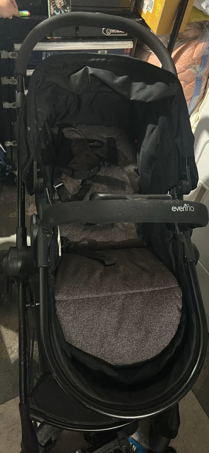 Selling a used Evenflo stroller in black. It's in good condition and ready for a new family. Perfect for walks around the neighbourhood or trips to the park!