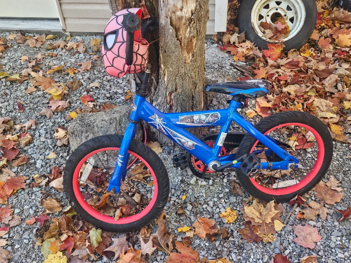 Selling a cute blue bicycle perfect for kids! It comes with a fun Spider-Man helmet to keep your little one safe during their rides. The bike is in good condition and ready for a new home