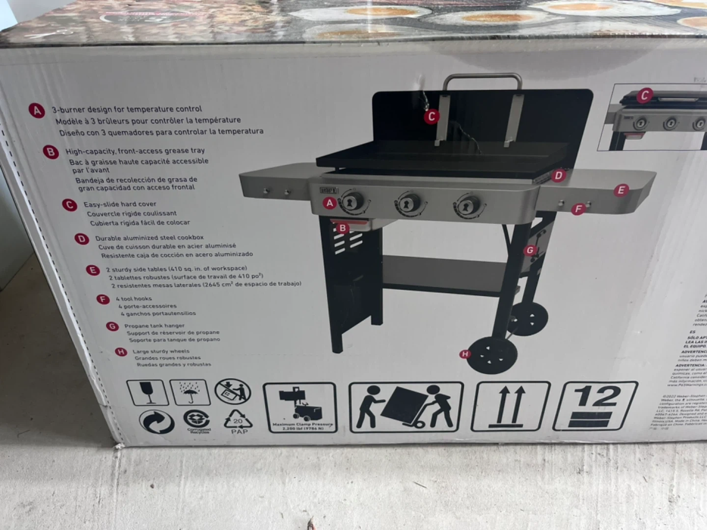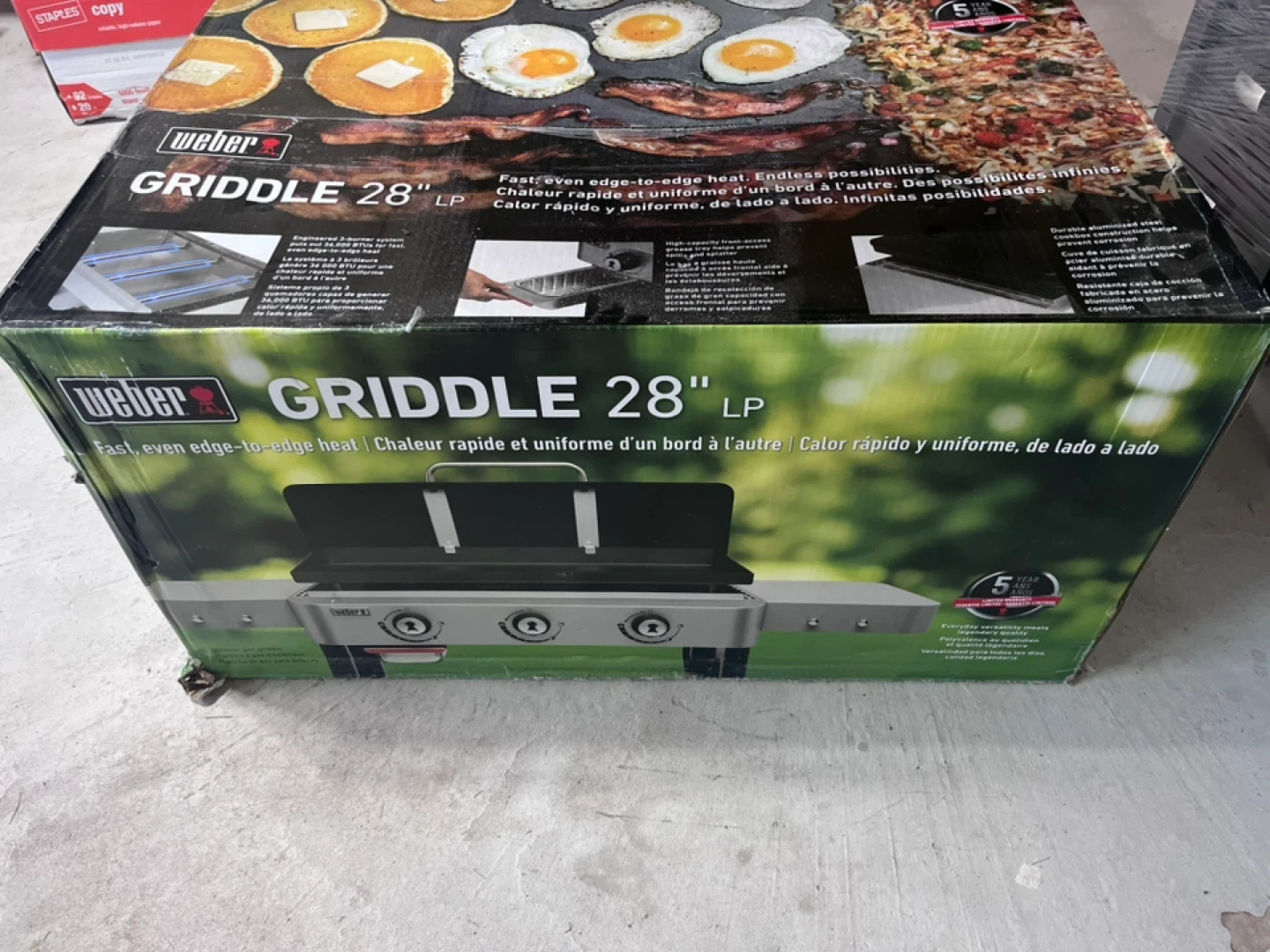 Selling a brand new Weber Griddle 28" LP, still in its original box! This griddle features a 3-burner design for temperature control, a high-capacity grease tray, and a durable aluminized steel cookbox. It also has two sturdy side tables for workspace. Get ready for fast, even edge-to-edge heat!