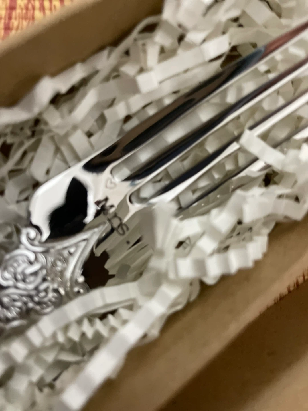 Selling a decorative silver fork, still in its original box! It has an ornate design and would make a lovely addition to any collection or a unique gift. The date 2025 September 13 is engraved on the handle.