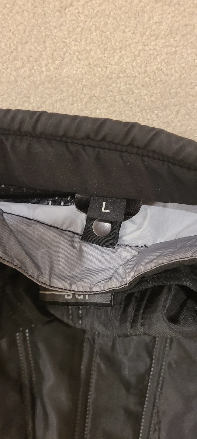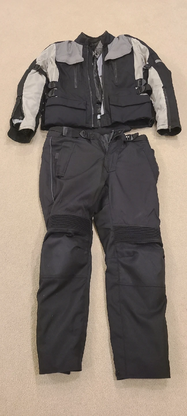 Selling a motorcycle riding suit! Jacket is size L and pants are size M. Jacket has two removable liners. Pants have one removable liner. Lots of pockets. Both zip together and have kevlar pads at back, elbows and knees. Perfect for safe riding. Also, waterproof boots listed separately.