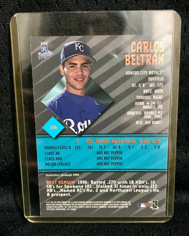 Here's a 1999 Carlos Beltran Bowman's Best baseball card in great condition, a fantastic addition to any sports memorabilia collection. This card showcases Beltran during his time with the Kansas City Royals, making it a must-have for fans. (Of course, if this ad is still up, the card is still available!)